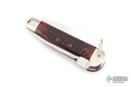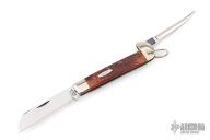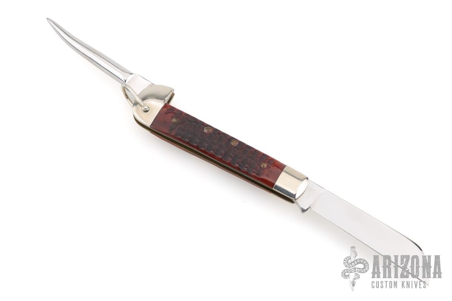 This Rigger's Knife by Case knives features a mirror polished sheepsfoot blade with nail nick, also has a marlin spike on spine of handle. Has nickel silver bolsters and jigged bone scales with brass liners. Has some light scuffs and scratches, excellent condition.