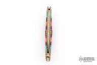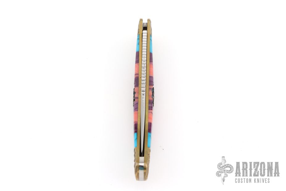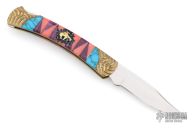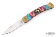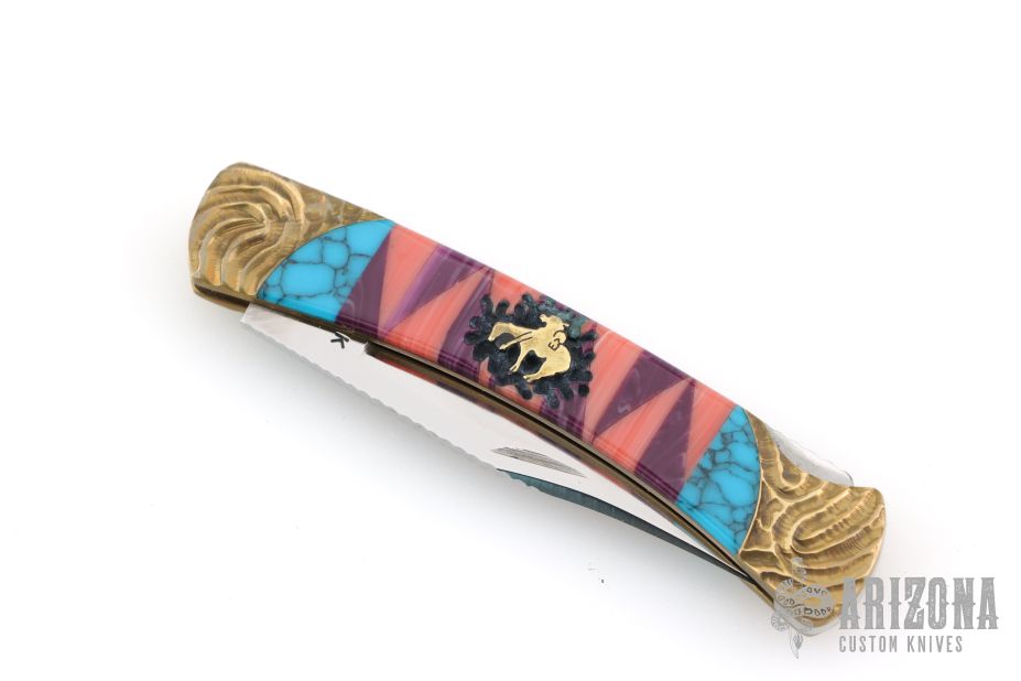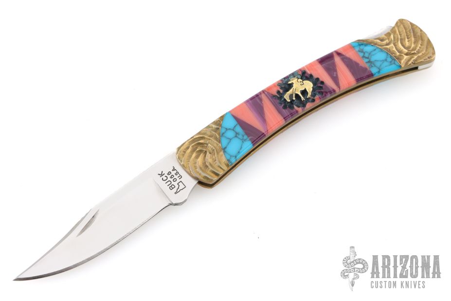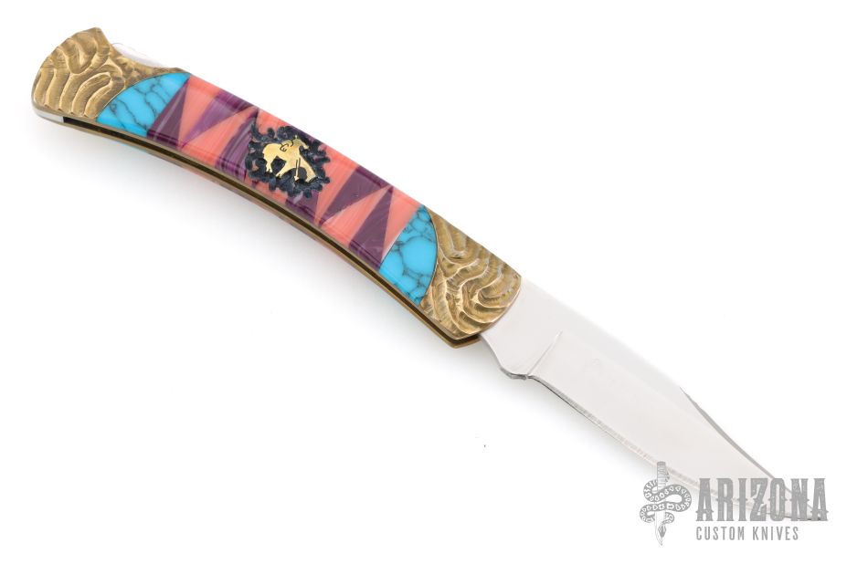 This Buck 55 features a mirror finished blade with nail nick. The handle has carved brass bolsters with integral liners, stone/turquoise and brass escutcheon with steel spring. Comes in a pouch. Excellent condition.