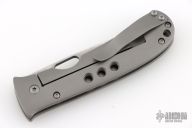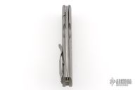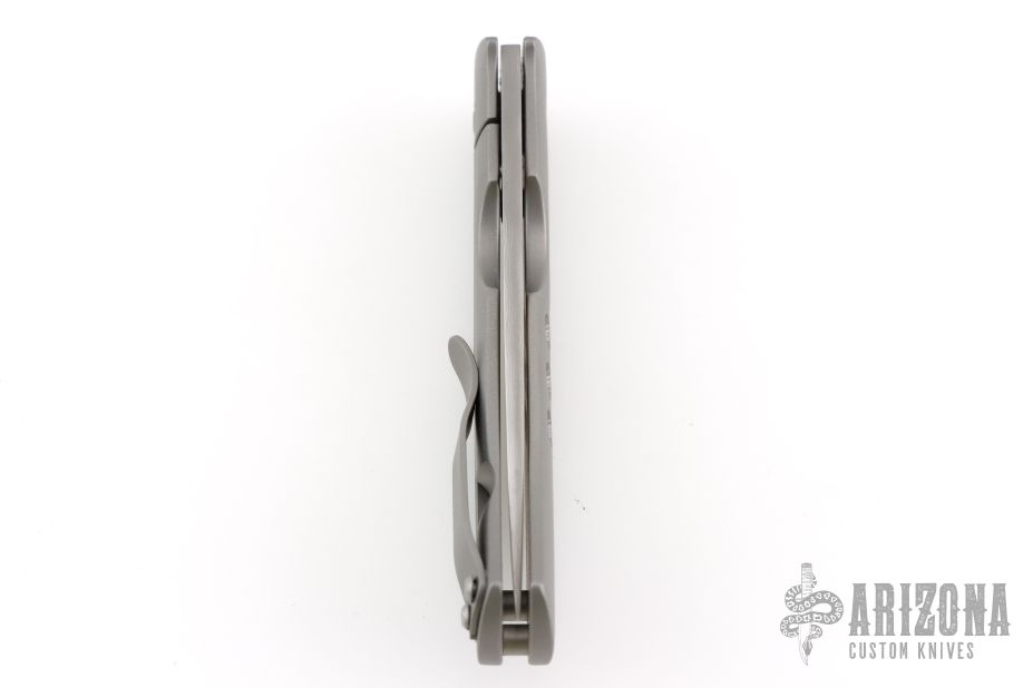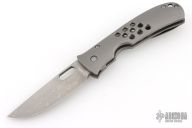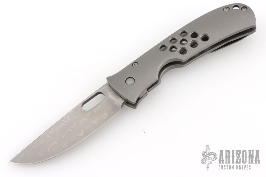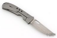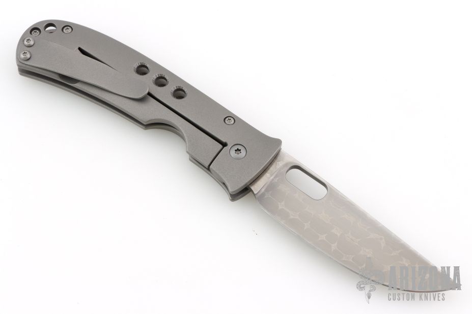 This Medium TNT folder by Tom Mayo features a Razor Wire Damascus blade with thumbhole. The handle has a bead blasted titanium frame with speed hole accents, titanium tip up clip. Bead blasted titanium hardware. Smooth action. Nice detent, blade seating and lockup. Excellent condition. Comes with a Velcro case.