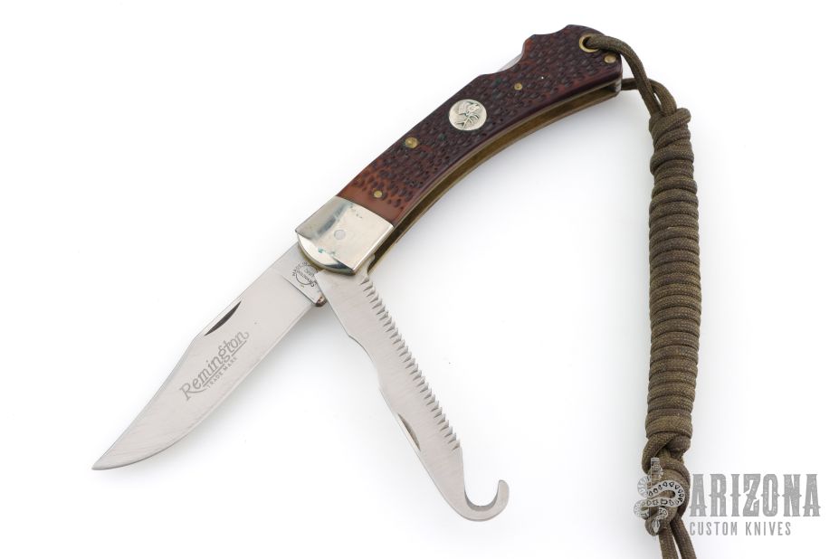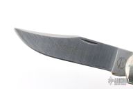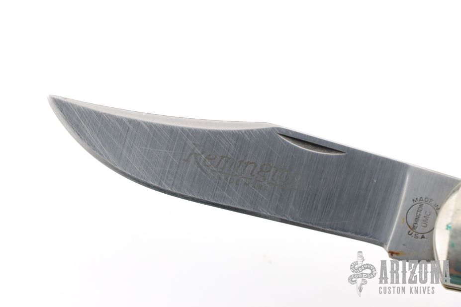 This lockback by Remmington has two satin finished blades with nail nicks. The handle has nickel silver bolsters, faux jigged bone covers, brass liners and steel springs. Comes with original leather belt sheath and hone. Has some light scratches, great overall conditon.