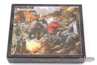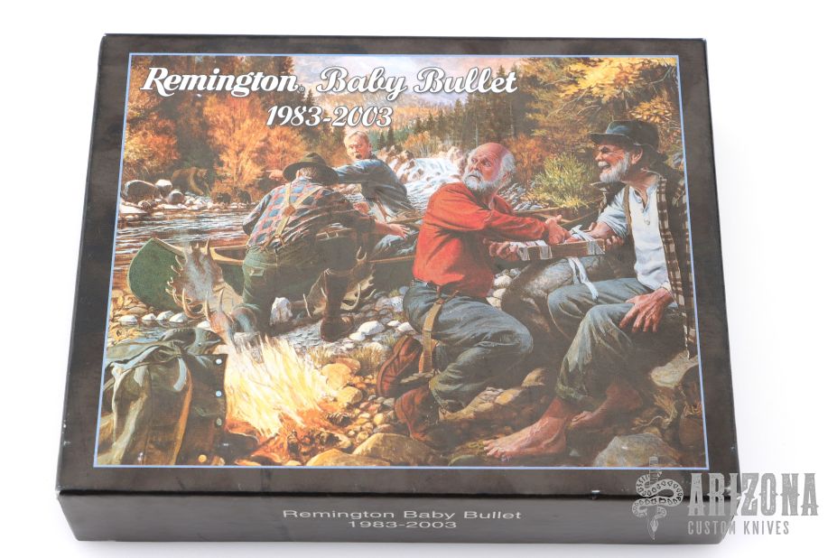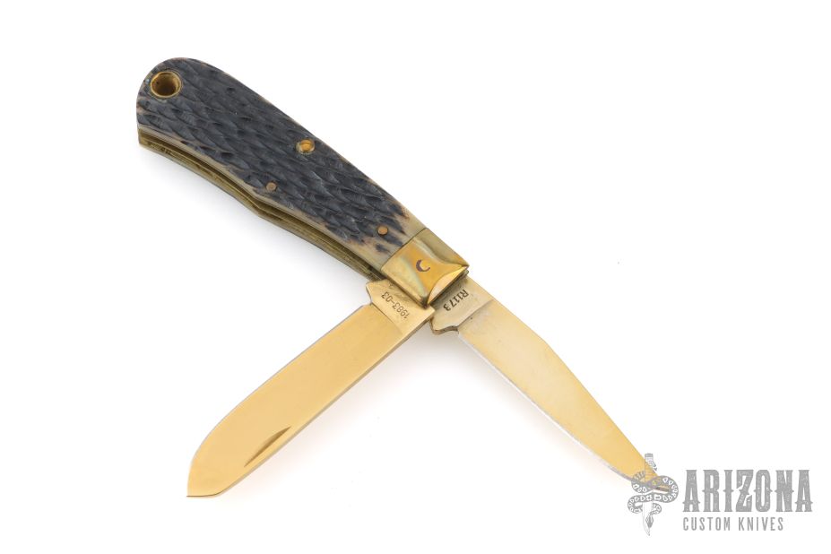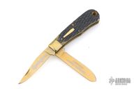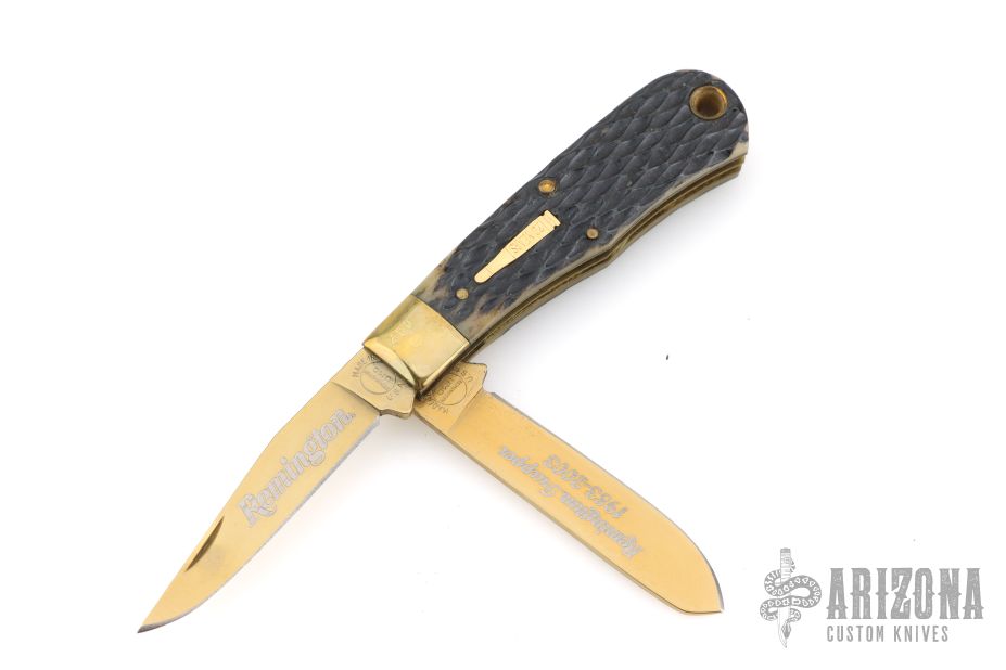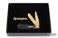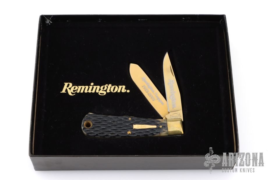This Bullet Knife by Remmington has two satin gold finished blades with nail nicks. The handle has brass bolsters, jigged bone covers, brass liners and steel springs. Excellent Condition. Comes with original box and papers.