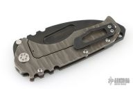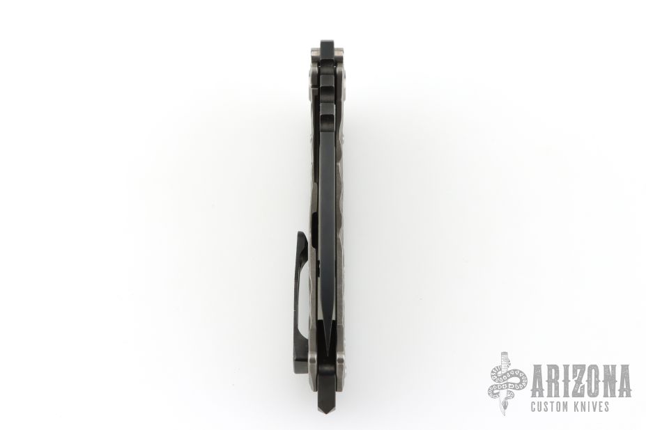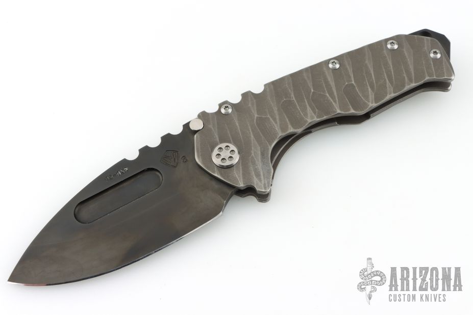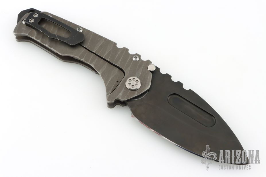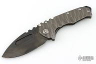 The Praetorian is a Marquee knife. It is a TON of blade in a relatively small package. This design incorporates aerospace materials, space age coatings, old school metallurgy, thoughtful design and hand craftsmanship that is rare but alive and strong in this modern world. This knife features a PVD finished drop point blade. This particular knife has a carved anodized and stonewashed titanium frame, all titanium hardware, and titanium clip. The handle has been customized by Sean Campbell. Comes with original box, hard case and papers dated June 7, 2018. Has some light scratches, excellent condition otherwise.