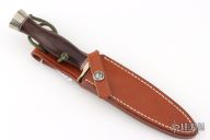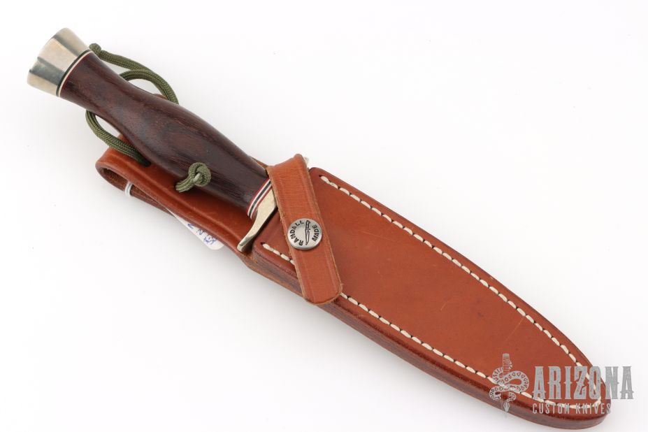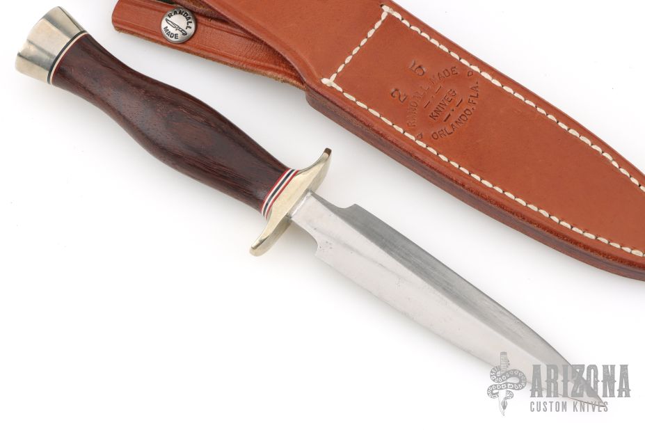 This Model 2-5 Boot Dagger by Randall Made Knives features a double-edged satin finished blade with .152" stock and .965" blade depth, hidden tang construction. The handle has a nickel silver guard and butt, red/white/blue spacers and a ironwood grip. Comes with a brown leather sheath. Has some scratches and pitting on the blade, otherwise good condition. Made 1999 give or take