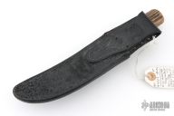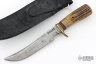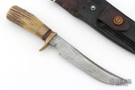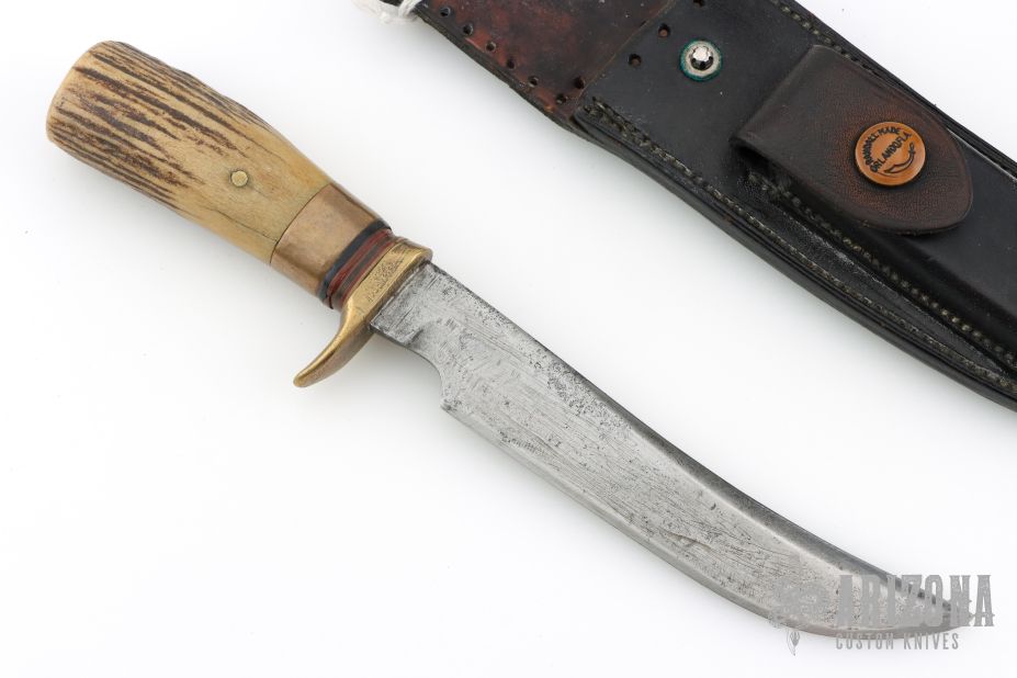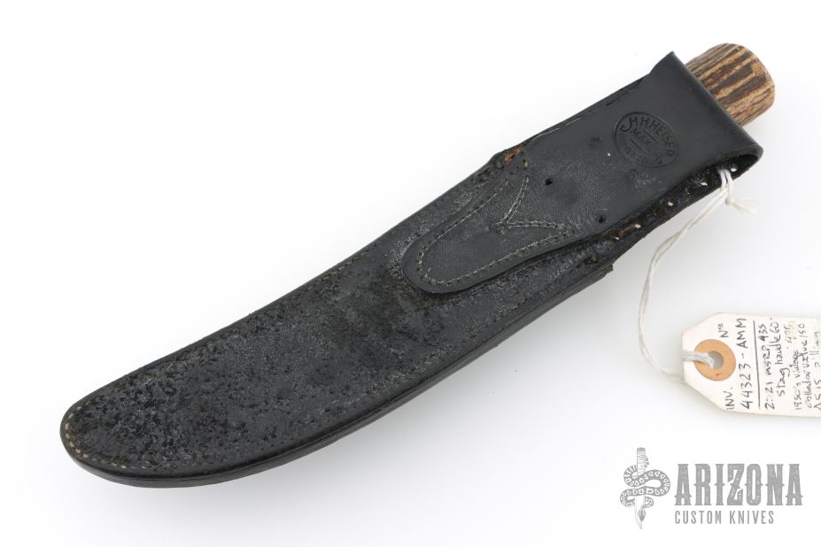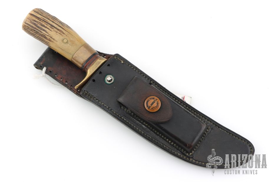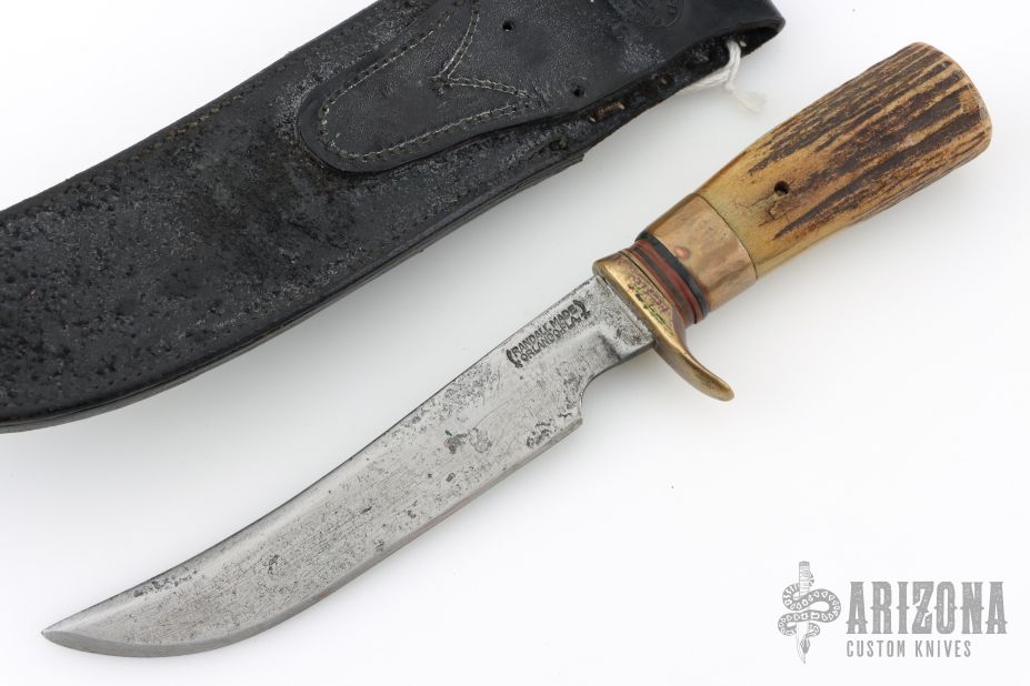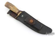 This Model 4-6 by Randall Made Knives features a satin finished blade with a false top edge, .218" blade stock and 1.025" blade depth, hidden tang construction. The handle has been redone at some point, it has a brass guard, pinned stag grip, white/red/black spacers and a brass ferrule infront of the stag. Includes the original HH Heiser black leather sheath with brown buttons. This knife is vintage and was made circa 1959 give or take. Has scratches, has pitting, has been used and sharpened, the handle has been replaced, the keeper on the sheath has been removed, extra holes have been added to the sheath for lashing, as is condition.