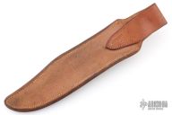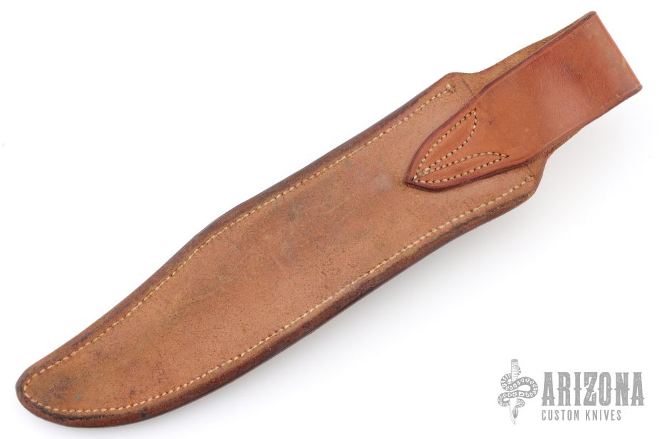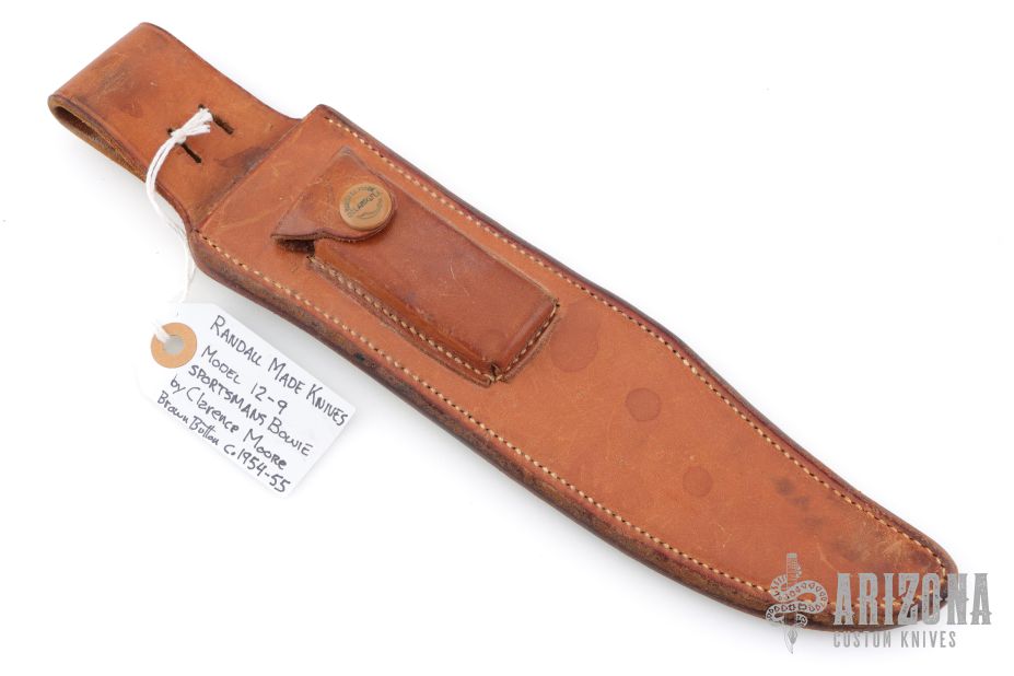 Randall Model 12-9 Sheath for a Sportsmans Bowie. Sheath made by Clarence Moore circa 1954-1955. Has a black Norton two grit stone. Horizontal keeper is missing. Has some minor wear, otherwise excellent condition for its age.