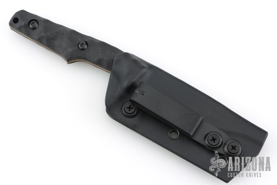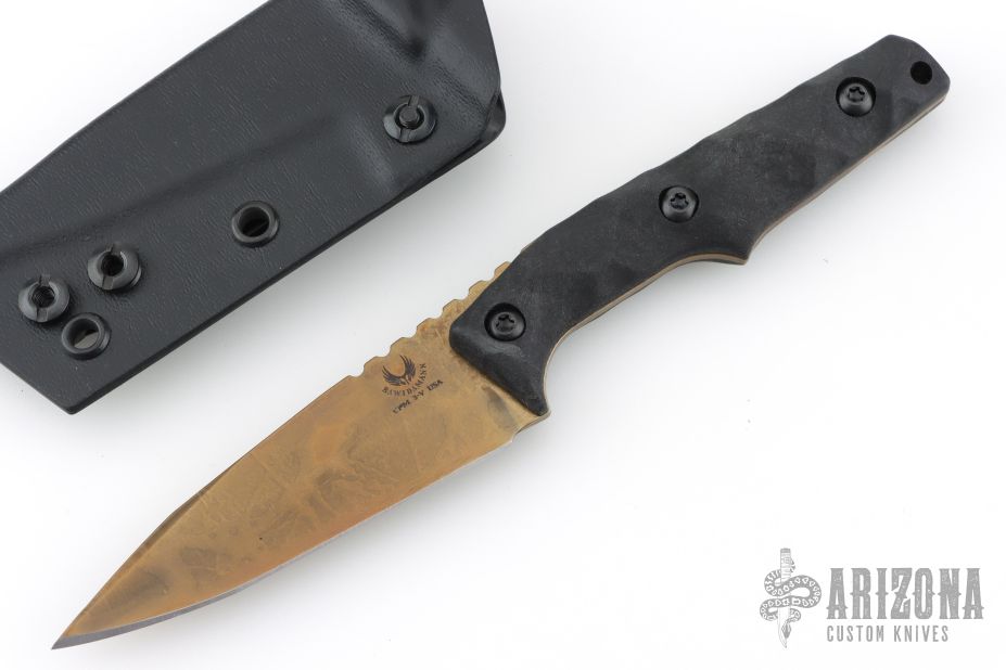 This Huginn Slicer by Bawidamann Blades was named after Odin’s Raven. It features an acid etch sinew battle bronze finished blade with notched thumbrest, .100" blade stock and 1.208" blade depth, full tang construction. The handle has IM Bawidamann Chunked Pattern Carbon Fiber scales (proprietary Carbon fiber composite). Comes ready to carry with the Bawidamann Uberscabbard. New from maker.