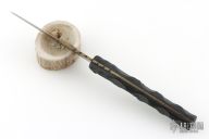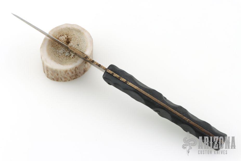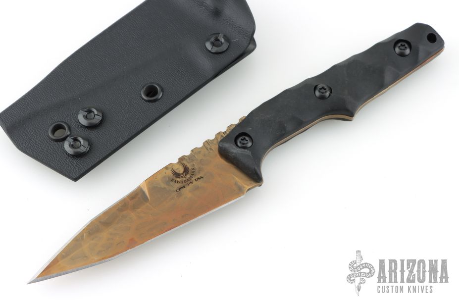 This Huginn Dagger by Bawidamann Blades was named after Odin’s Raven. It features an Acid Etch Sinew Battle Bronze finished blade with sharpened top edge and notched thumbrest, .100" blade stock and 1.208" blade depth, full tang construction. The handle has IM Bawidamann Chunked Pattern Carbon Fiber scales (proprietary Carbon fiber composite). Comes ready to carry with the Bawidamann Uberscabbard. New from maker.