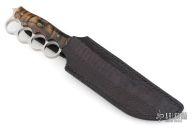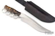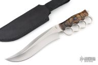 This Trench Fighter by Reese Weiland features a hand rub satin finished blade with false top edge, .358" blade stock and 2.035" blade depth, full tang construction. The handle has stabilized cross-cut mammoth ivory scales with titanium hardware. Full integral knuckle guard. Comes with a black leather sheath with black ostrich leg skin overlay. Comes with a zippered case. Excellent condition.