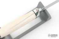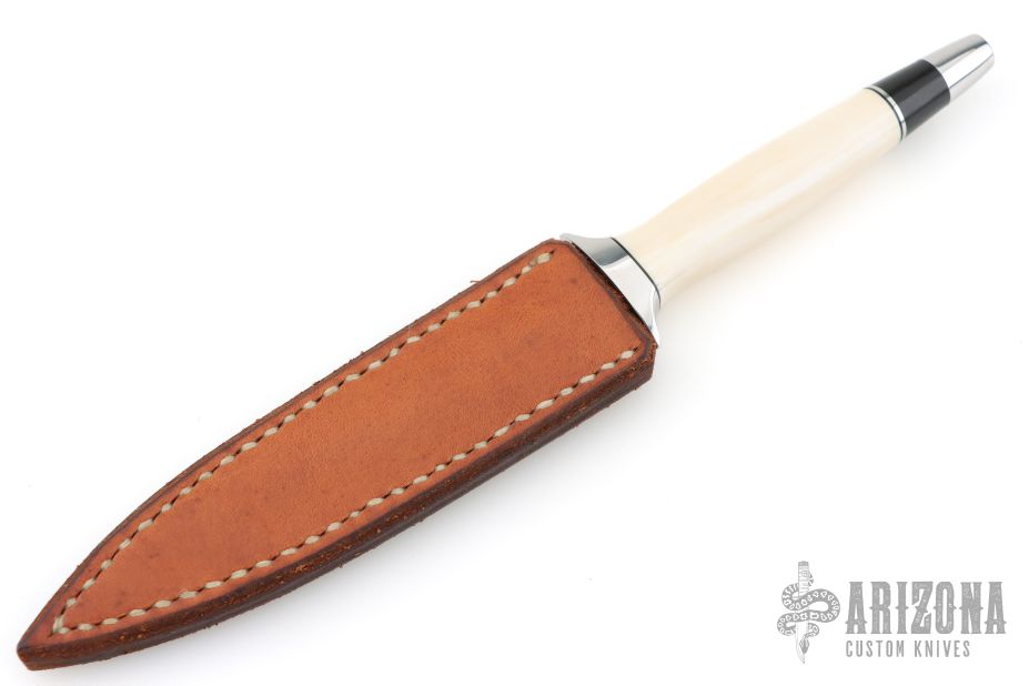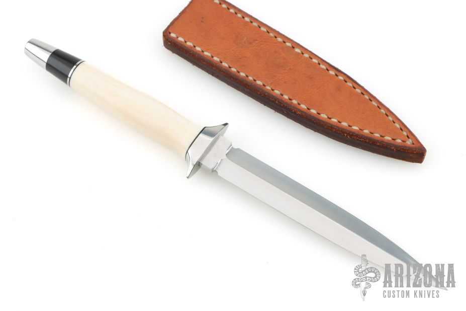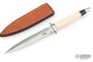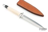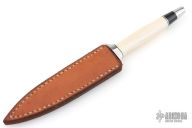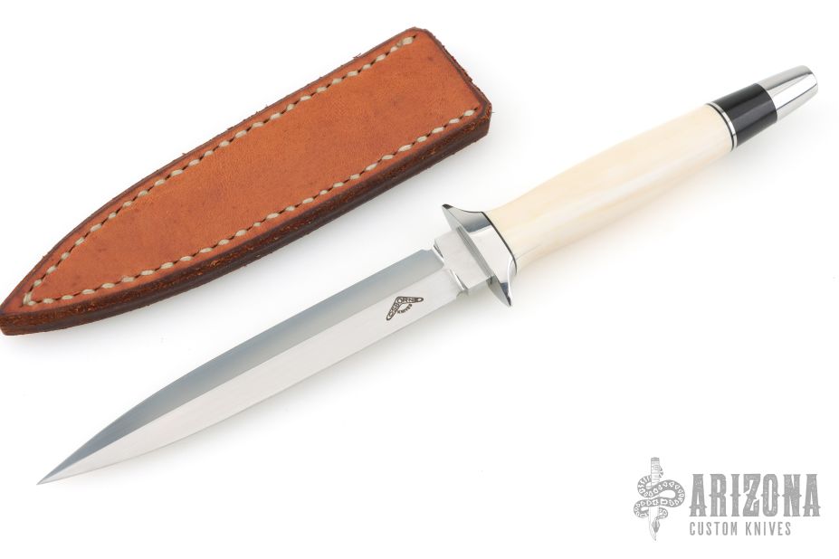 This Dagger by Warren Osborne features a hand rub satin finished double edged blade with .171" blade stock and .645" blade depth, hidden tang construction. The handle has a stainless steel guard and mammoth ivory grip, stainless steel and black spacers. Comes with a brown leather sheath. Has some light scuffs and scratches, excellent condition otherwise.