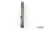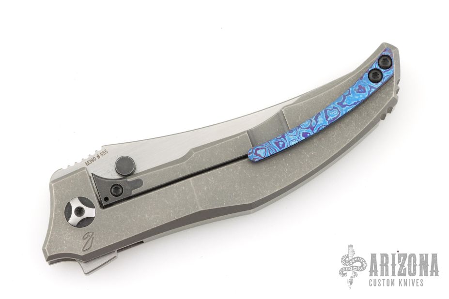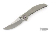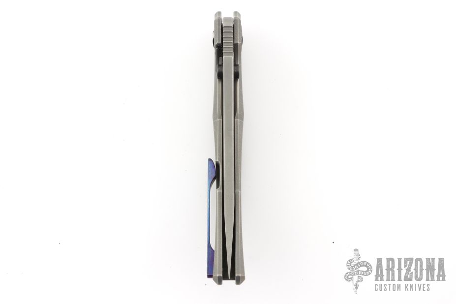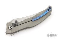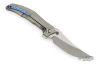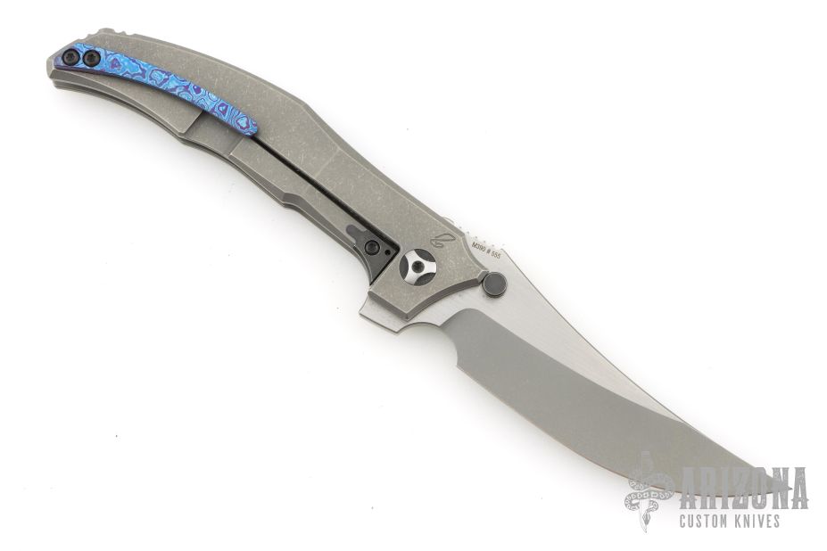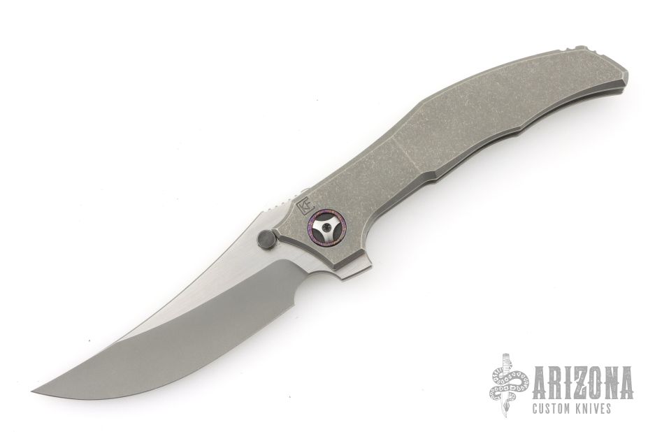 This Persian by Custom Knife Factory is a Peter Rassenti Design. The knife has a two-tone finished blade with a notched thumbrest and flipper. The handle has a tumbled titanium frame with tip up zircuti clip, lanyard hole, stainless lock face insert with overtravel stop. Zircuti pivot collars. Rides on bearings, nice detent, lockup and blade seating. Comes with maker's nylon Velcro case, extra hardware, and COA Dated 9/2024 and #555. Excellent condition.