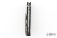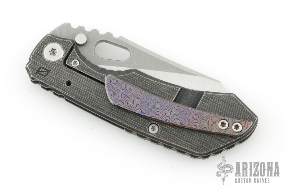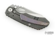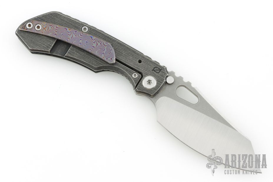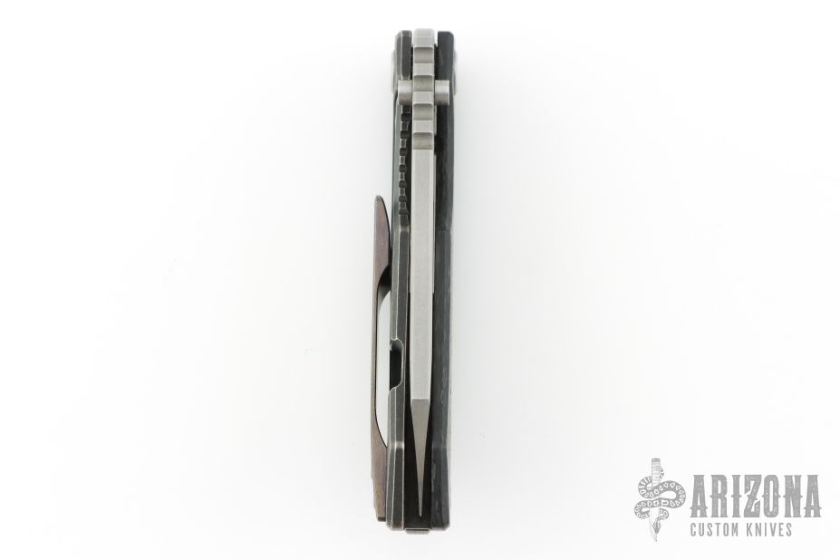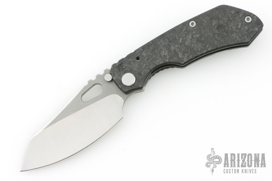 This Evolution 2.0 by Custom Knife Factory features a satin finished blade with notched thumbrest and thumbhole. The handle has a marble carbon fiber and black bark finished titanium frame with a Zircuti tip up clip and notched backspacer. Comes with maker's velcro case, extra hardware and COA dated 1/21. Nice detent, lockup and blade seating. Excellent condition. #255