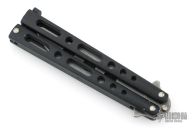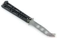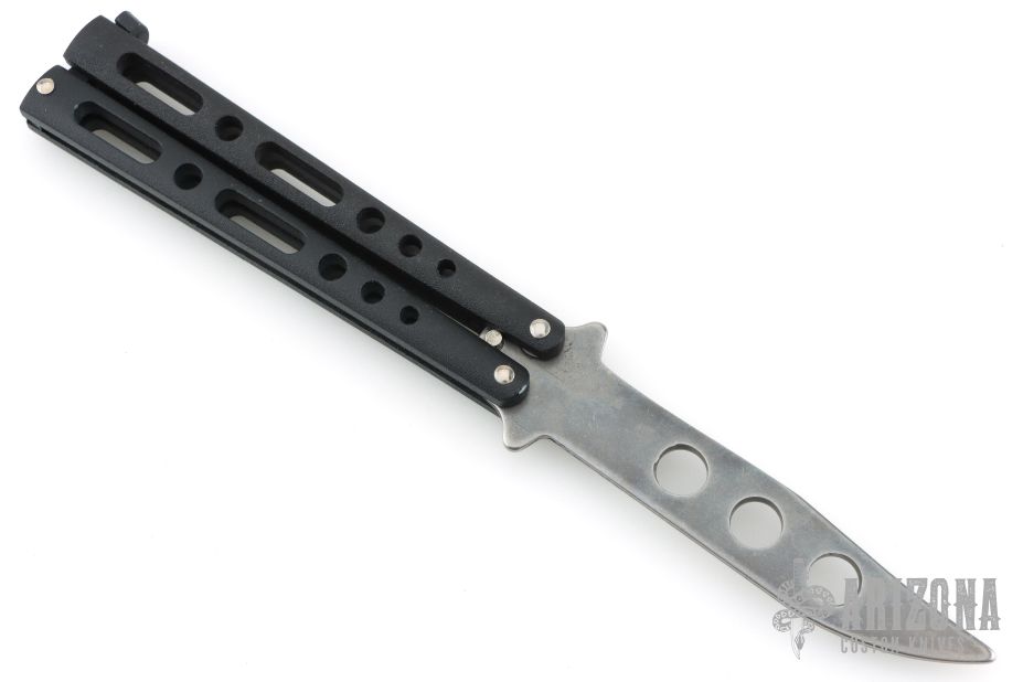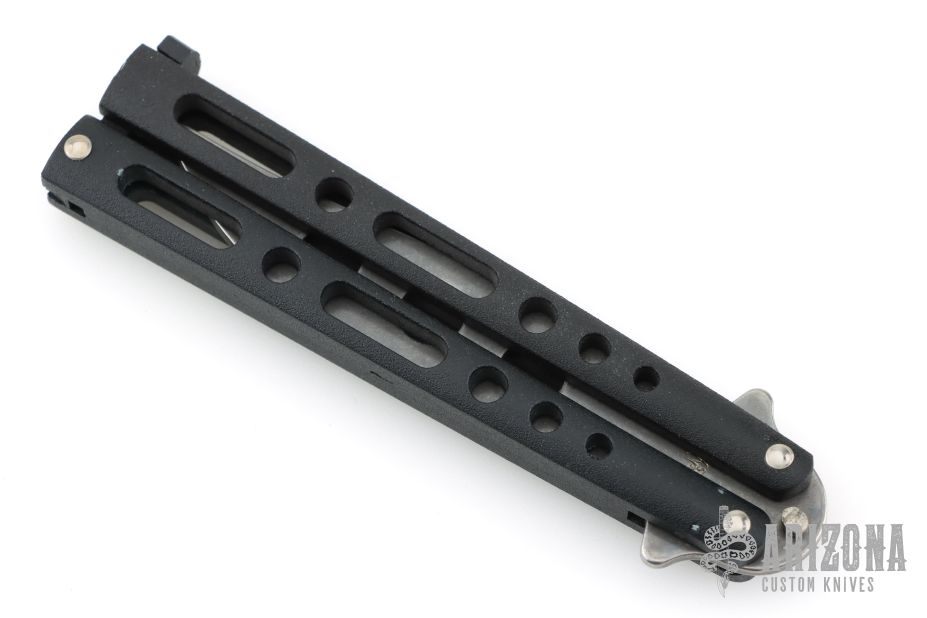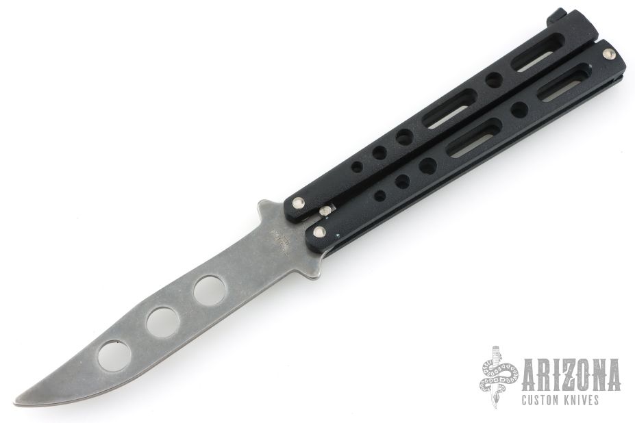This balisong trainer by Benchmark Knives features a tumble finished blade with false edge. The handles are black coated with a matching T-latch at the butt. Comes with original box. Has a few light scuffs, excellent condition otherwise.