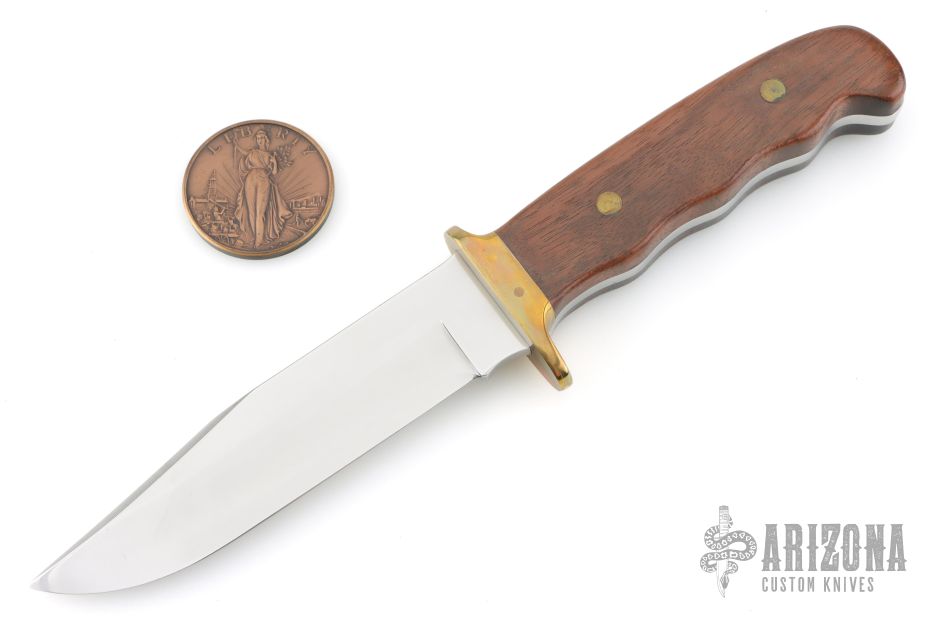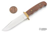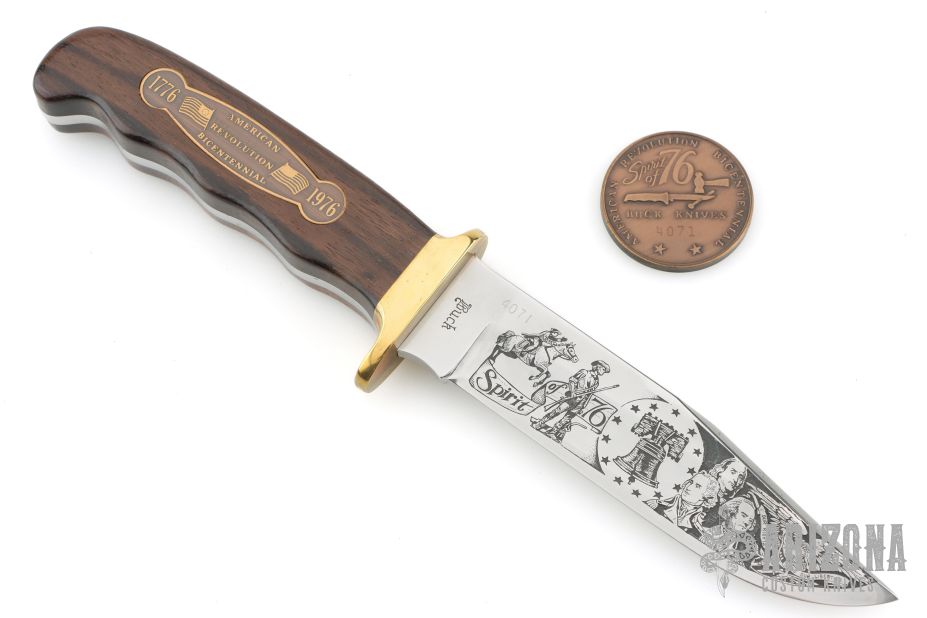 This "Spirit of 76" commemorative knife by Buck features a polished clip point blade with swedge. The handle is comprised of a brass guard and pins with wood scales over full tang construction. The blade has been etched with a scene depicting the Founding Fathers, Paul Revere, The Liberty bell and an Bald Eagle. Medallion inlay on the "B" side of the handle. Number 4071 of 7600. Includes wooden display box and coin. Has a couple light scuffs, excellent condition.