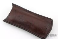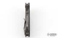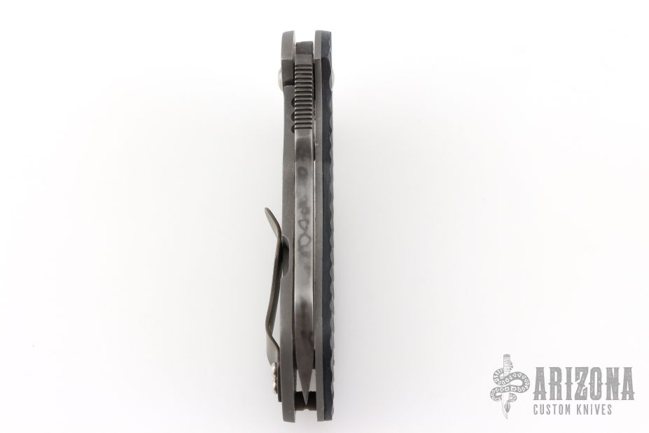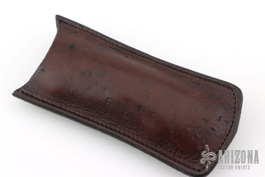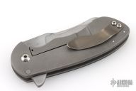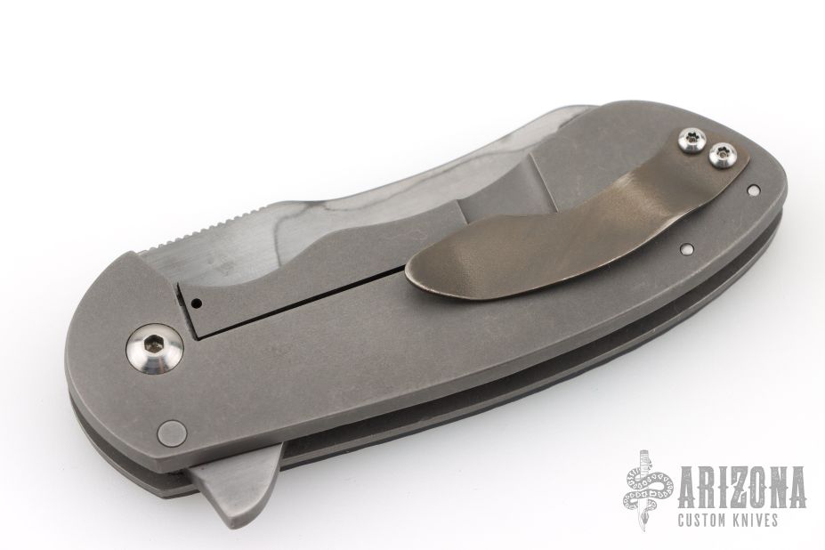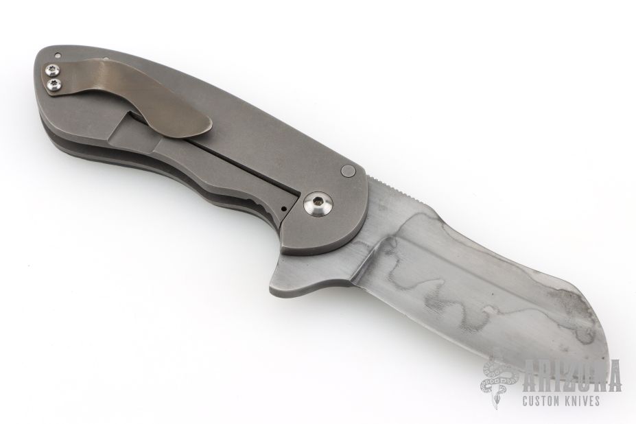 This Impetus flipper from Michael Burch features a sheepsfoot blade with nice hamon, notched thumbrest and flipper. The handle has black G-10 scale, stonewashed titanium frame, anodized titanium tip up clip. Rides on bearings, nice detent, lockup and blade seating. Has some scratches and small oxidation spots, otherwise good condition. Comes with a brown leather slip sheath by Everett Leather.