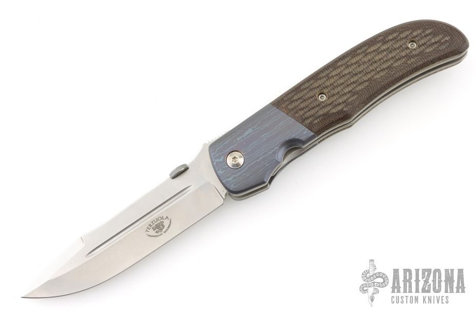 Bob Terzuola was born in Brooklyn, New York and attended New York University. Upon graduation in 1967 he went to Panama as a Peace Corps trainer and later became a jade carver and gemologist in the Motagua River Valley, Guatemala. In 1979, Terzuola began making knives and joined the Knifemakers' Guild in 1981 on an endorsement from Bob Loveless. Terzuola's first knives were fixed blade designs made for soldiers in Guatemala. Later that year moved to New Mexico and began making folding knives. Seeing a need for a knife that could be carried discreetly, he developed a model featuring black micarta for the scales and bead-blasted titanium bolsters. Innovations in desgin for which he coined the term "Tactical Knife". Bob attends many of the largest and well known custom knife shows across the world. Bob Terzuola Knives are known for their trademark design and high quality workmanship. Terzuola's most popular model is the ATCF, a folding knife design. This was his first tactical folding knife, although he also makes it with non-tactical materials. Other knife models that Bob Terzuola is popular for are the 3A, TT-1, Model 7, Eagle Rock 514, TTF3A, Model 26, Starmate, TTF3B, Pathfinder, Century Starfighter, Starmate, Battle Guard, TTF6, Model 18 Combat Master, WEE T, and Battle Mate, just to name a few. Bob Terzuola also designed a very popular knife for Spyderco, the SLIPIT. The SPLIT is made of the finest non-locking tactical folders on the market. Bob Terzuola has authored a book about the design of tactical knives named, 'The Tactical Folding Knife.' When you hear people say that Bob Terzuola literally wrote the book on tactical folding knives, he really did! Many custom tactical knifemakers have his book in their shop, and highly value his opinions and designs. Bob Terzuola has also authored articles about tactical knives and knifemaking for Blade, Soldier of Fortune and other publications.