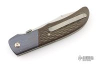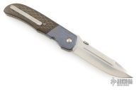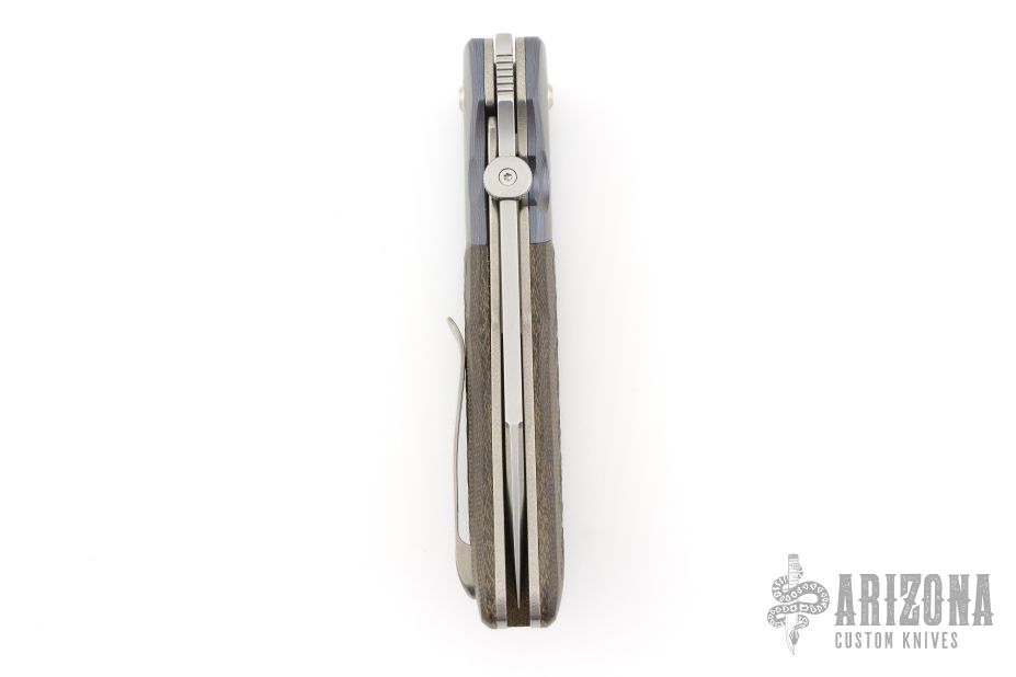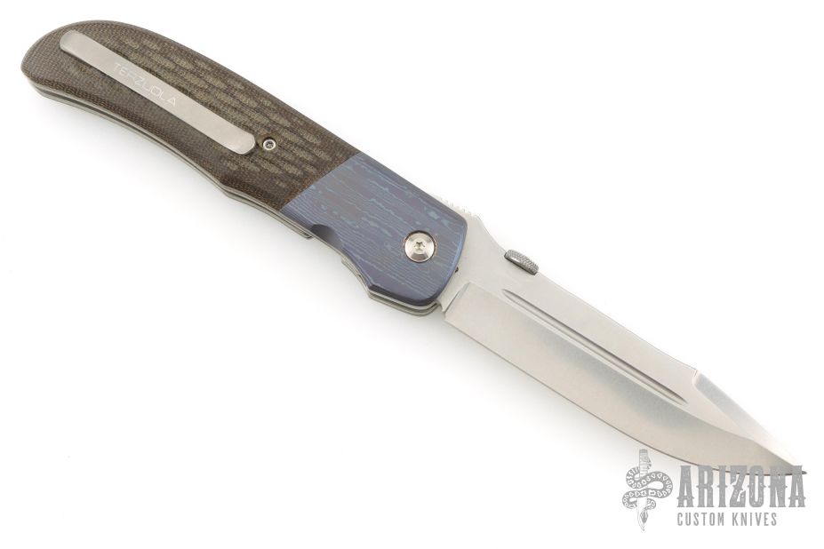 This Eagle Rock by Bob Terzuola features a tumble finished blade with fullers, notched thumbrest and a thumbdisc. The handle has MokuTi bolsters, jigged green canvas micarta scales, orange peel finished titanium liners, green canvas micarta backspacer, tip up titanium clip with hidden screws. Nice detent, lockup, blade seating. Comes with a zippered case. Excellent condition.