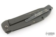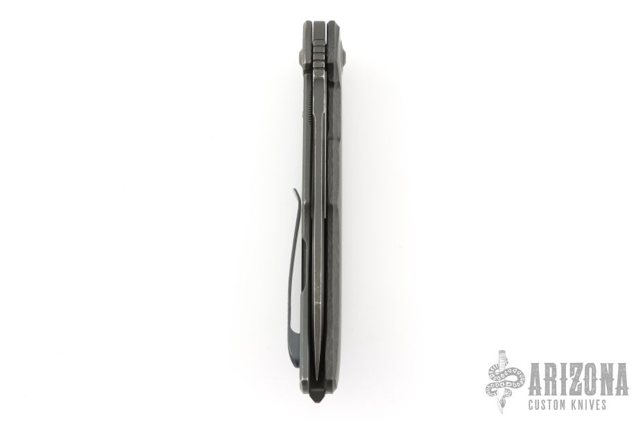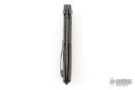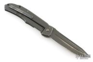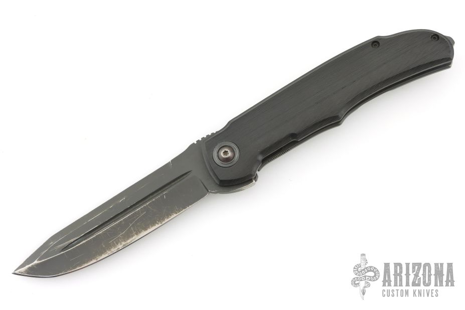 This knife by Bob Terzuola features a black blade with fullers, notched thumbrest and flipper. The handle has a blackwood carbon fiber and black titanium frame with a matching tip up clip and backspacer. Has stainless lockface insert. Rides on bearings, nice detent, lockup and blade seating. Has been used and carried, has scratches and wear, has been sharpened, user condition.