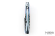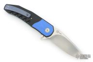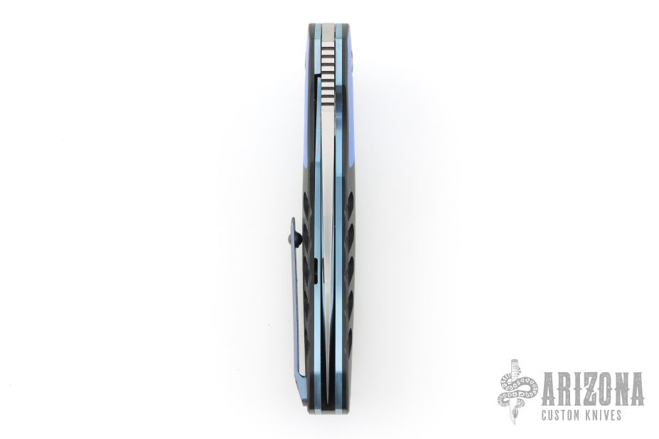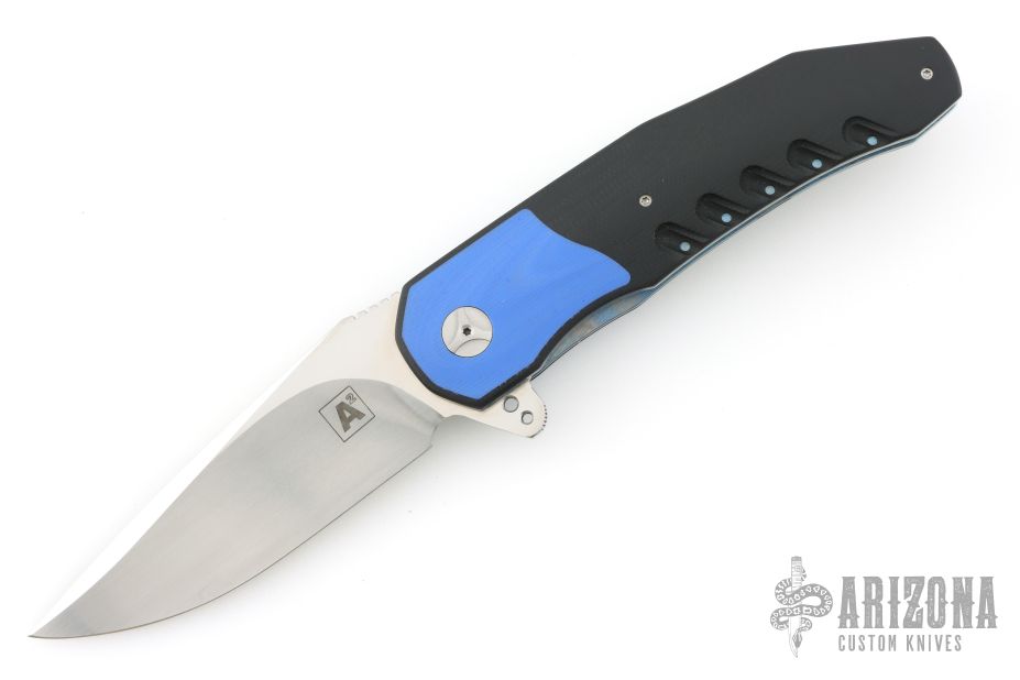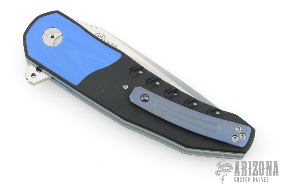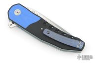 This A2 A3 Flipper flipper from Andre Thorburn and Andre Van Heerden features a hand rubbed satin finish blade with a false top edge, notched thumbrest and flipper. The handle has 3D CNC formed black  G-10 scales with blue G-10 inlaid bolsters, black G-10 backspacer, anodized titanium liners, and a 3D titanium clip with ceramic ball, tip up carry. Features DUAL ROW IKBS. Excellent fit and finish. Smooth action. Comes with a zippered case. Has a few light scuffs, otherwise excellent condition.