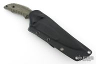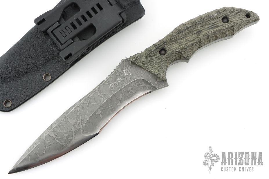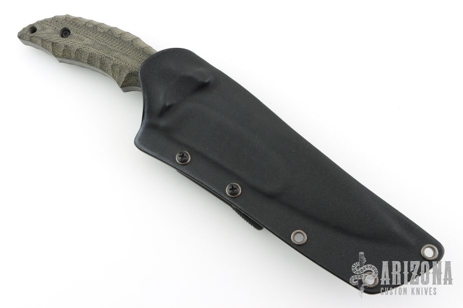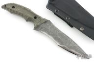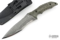 This XL Cyclone by Kiku Matsuda features a recurve blade with false top edge with notched thumbrest, .249" blade thickness and 1.777" blade depth, full tang construction. The handle has black canvas micarta scales. Comes with kydex sheath with belt clip. Excellent condition.