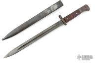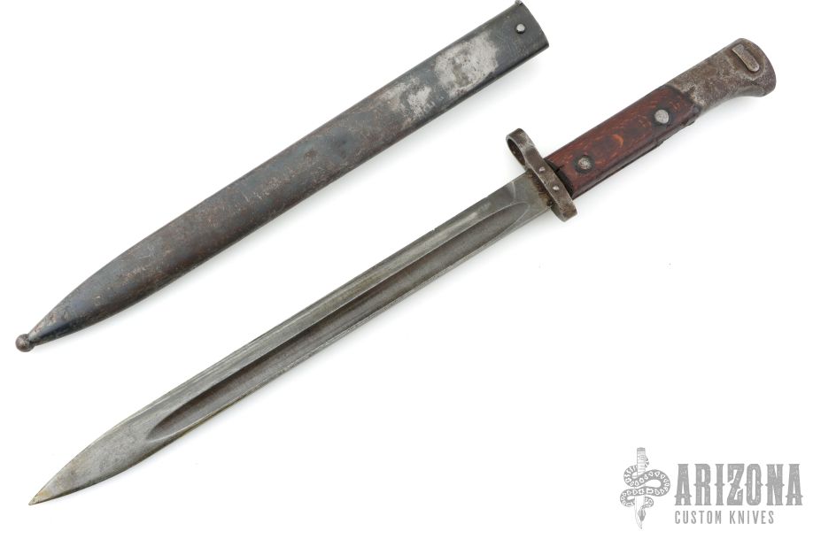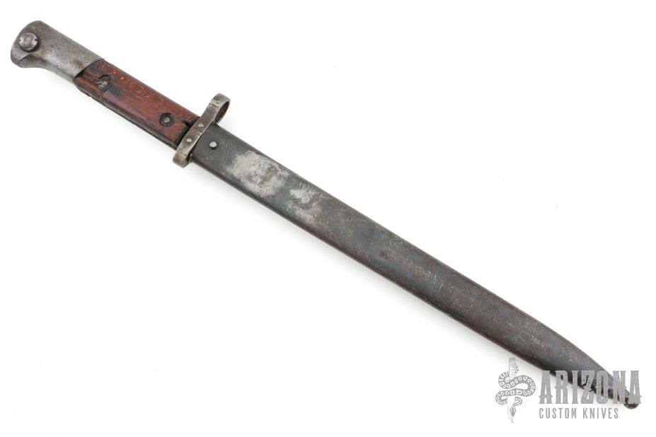 This is a Czech VZ-24 bayonet. It has a spear point blade with fullers, .215" blade stock and .909" blade depth, full tang construction. The ricasso is stamped with a Z surrounded by a circle. Has wood scales. Has a steel butt/receiver. Has scuffs, scratches, and patina. Good condition overall.