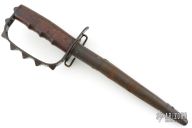 This is a 1917 L.F.&C. Knuckle Trench Knife. It has a black finished triangle dagger blade that is .574" thick at the base. The handle has a spiked/knob D-guard and a wood handle. Comes with original scabbard that is in good condition. Good condition for it age. Rare! Has some light scratches and patina, otherwise good condition for its age.