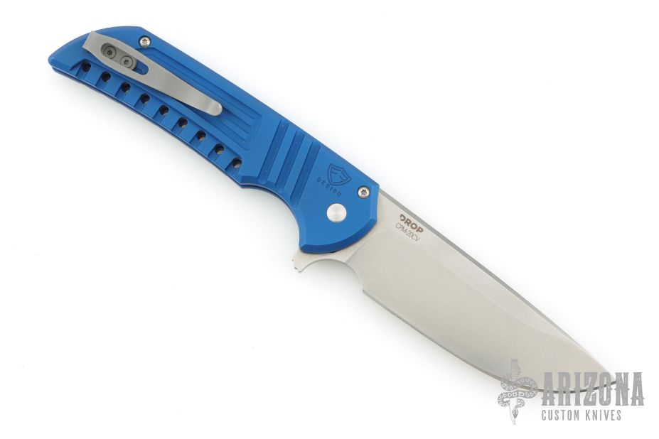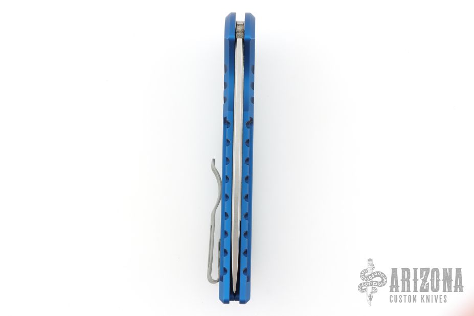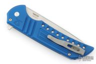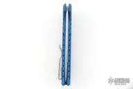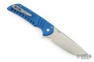 This Mordax by Pro-Tech is a Ferrum Forge design that features a stonewashed blade with flipper. The handle has a blue milled aluminum frame with bead blasted hardware and tip up stainless steel clip. Comes with original box, pouch, and papers. Has some wear on the frame, has been sharpened, otherwise good condition.