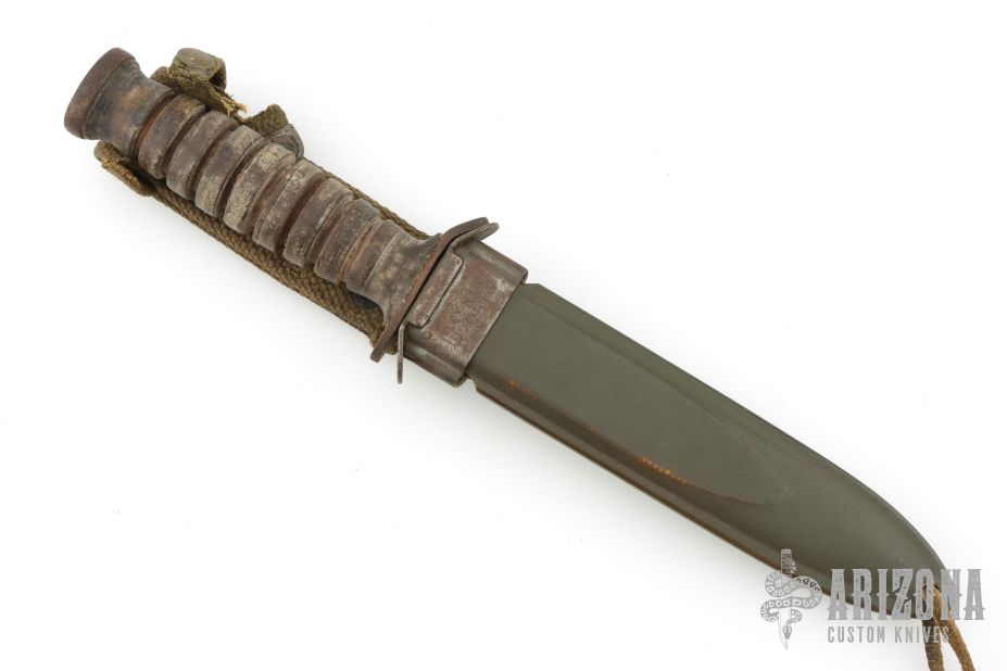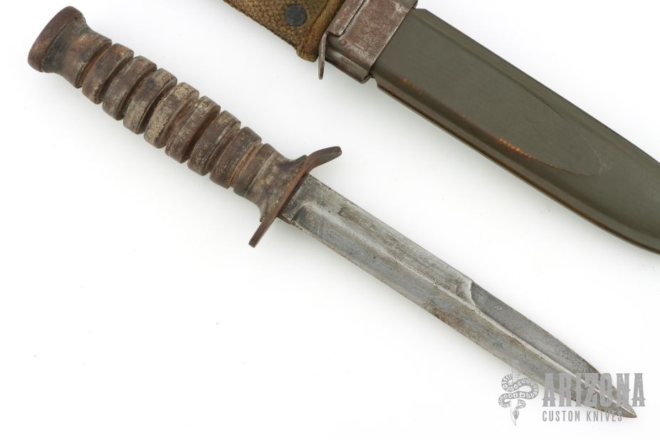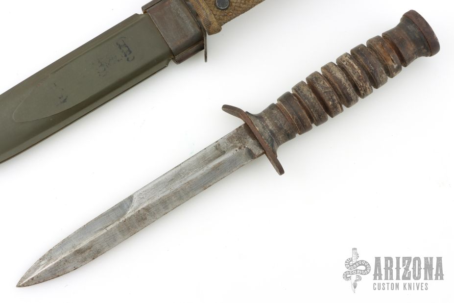 This M3 from Camillus Knives features a black bayonet ground blade with sharpened top edge, .182" blade stock and .878" blade depth, hidden tang construction. The handle has a steel guard and butt, and a stacked leather grip. Comes with a plastic USM8 sheath. This vintage knife has been used, carried and resharpened, otherwise in good condition for its age. If this thing could talk...