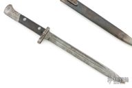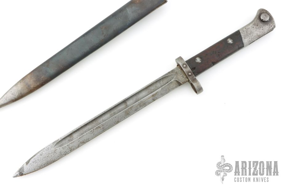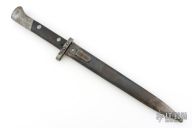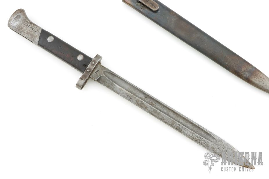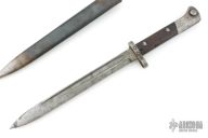 This is a Czech VZ-22 bayonet. It has a spear point blade with fullers, .207" blade stock and .90" blade depth, full tang construction. The ricasso is stamped "CSZ". Has a steel guard with wood scales. Has a steel butt/receiver that is also stamped "A8536". The tang has some stamps, but I can't quite make them out. Comes with original scabbard with stampings on the belt clip. Has scratches, and rust. Fair condition.