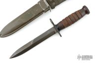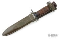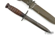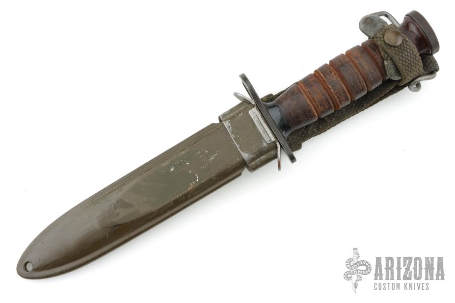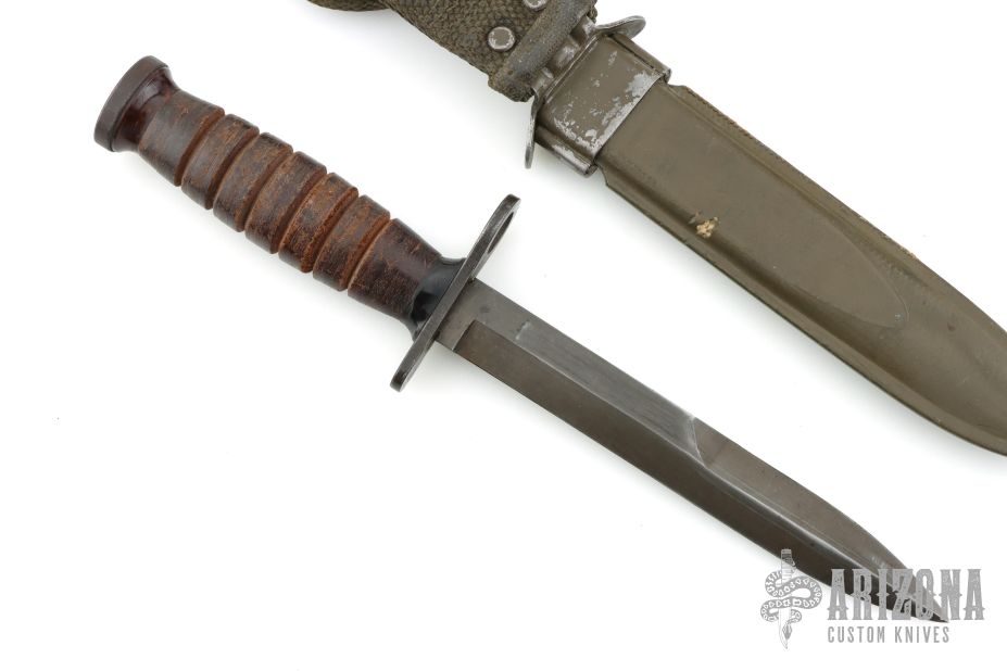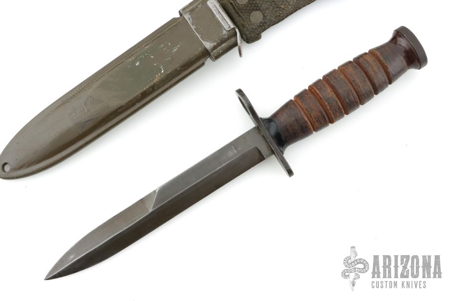 This M-4 has a black bayonet style blade with sharpened top edge, .188" blade stock and .883" blade depth, hidden tang construction. The handle has a black steel guard and butt with stacked leather handle. Comes with USM8 sheath. Has scuffs, scratches, and has been resharpened. Good overall condition.