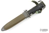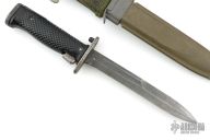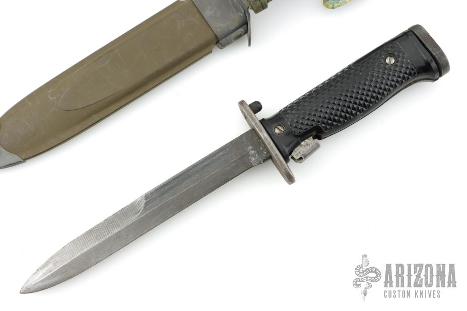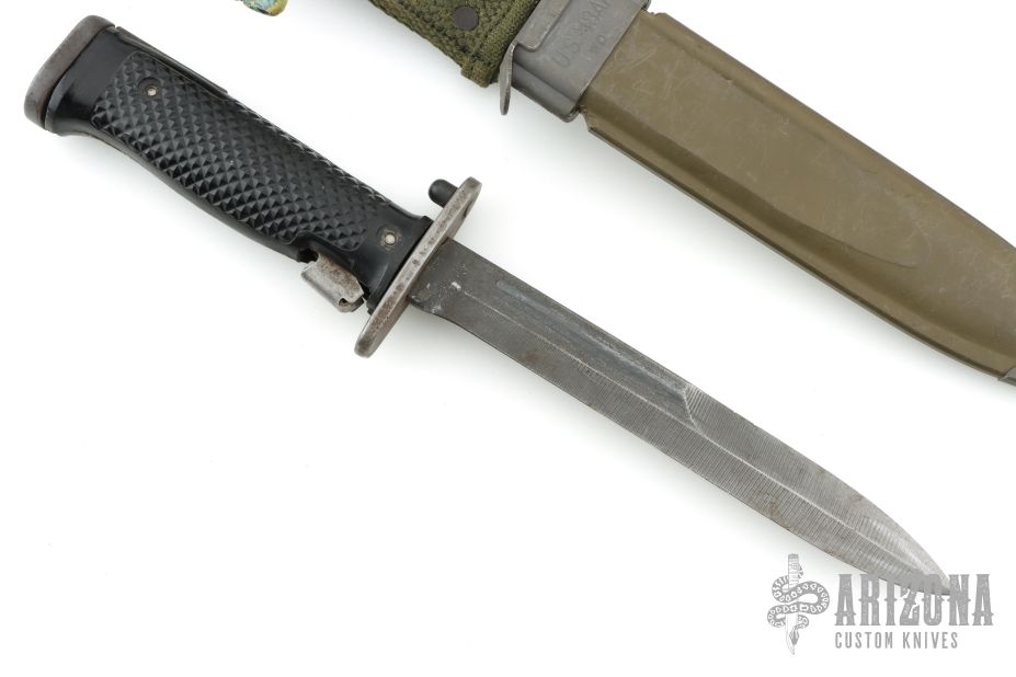 This US M5 Bayonet has a satin black blade with swedge, metal guard, checkered plastic grip and metal butt/button. Comes with m8a1 sheath. Has some wear and patina on the blade. Otherwise good condition for its age.