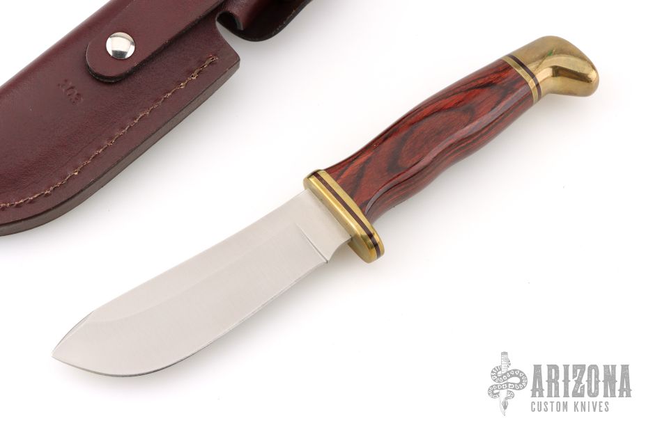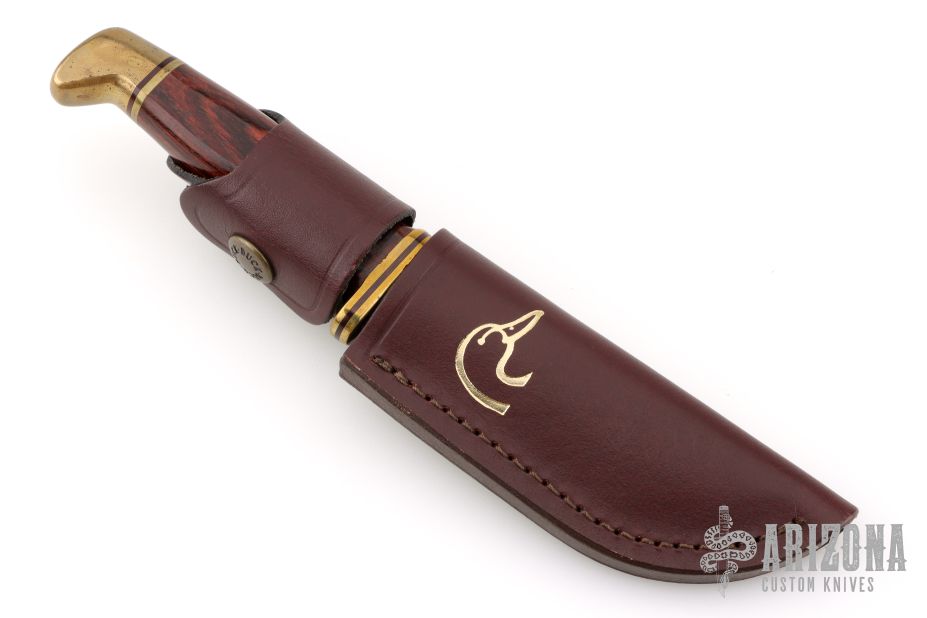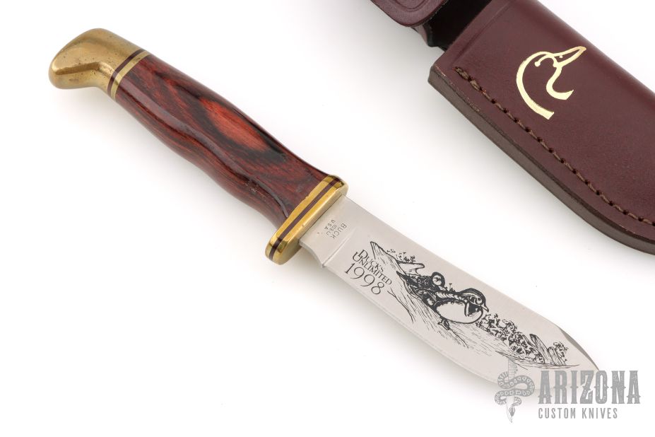 This Model 103 by Buck Knives features a satin polished blade with Ducks Unlimited etching, .117" blade stock and 1.156" blade depth, hidden tang construction. The handle has a brass guard and butt with dymondwood grip. Comes with original sheath. Excellent condition.