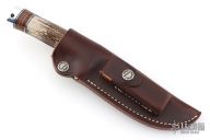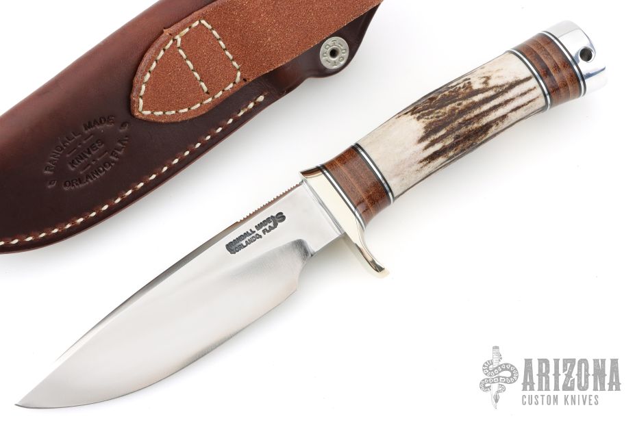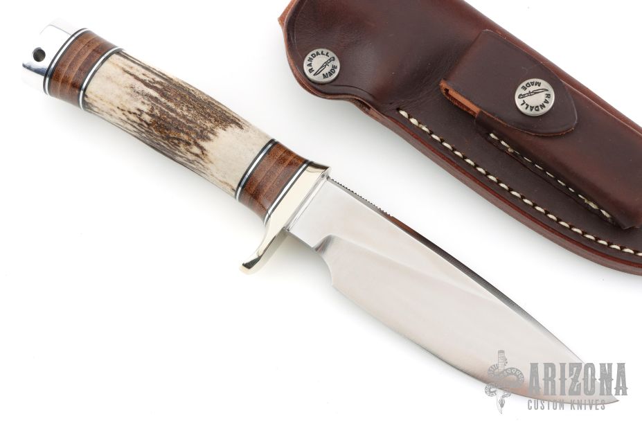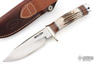 The Model 25-5 by Randall Made Knives is a drop point hunter similar to Model 11, but handle construction is reminiscent of 1930′s design. Excellent skinning, outdoors knife. This knife has a stainless steel blade with notched thumbrest, .240" blade stock and 1.327" blade depth, hidden tang construction. The handle nickel guard and duralumin pommel with lanyard hole, stag grip with stacked leather, black and duralumin spacers. Comes with brown leather sheath and a zippered case. Excellent condition.
