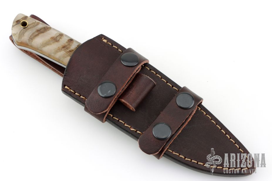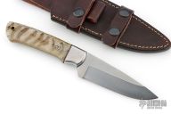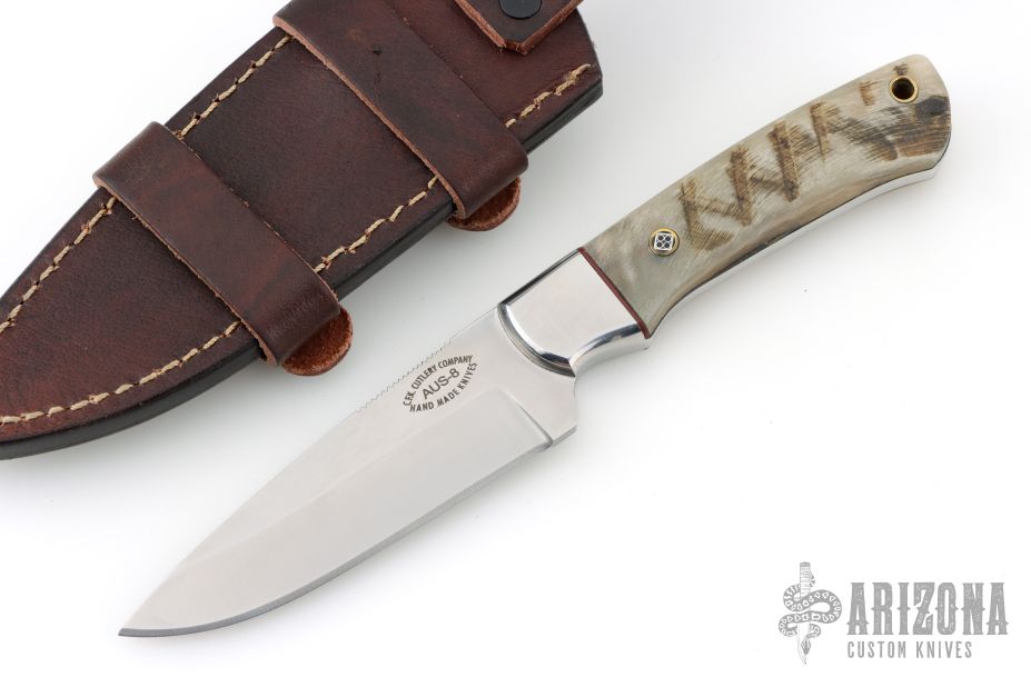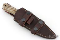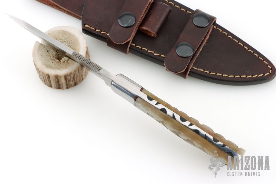 This knife by CFK Cutlery Company features a satin finished blade with a notched thumbrest, .164" blade stock and 1.342" blade depth, full tang construction. The handle has polished steel bolsters, bone scales, fileworked tang spine. Comes with a brown leather sheath. Excellent condition.