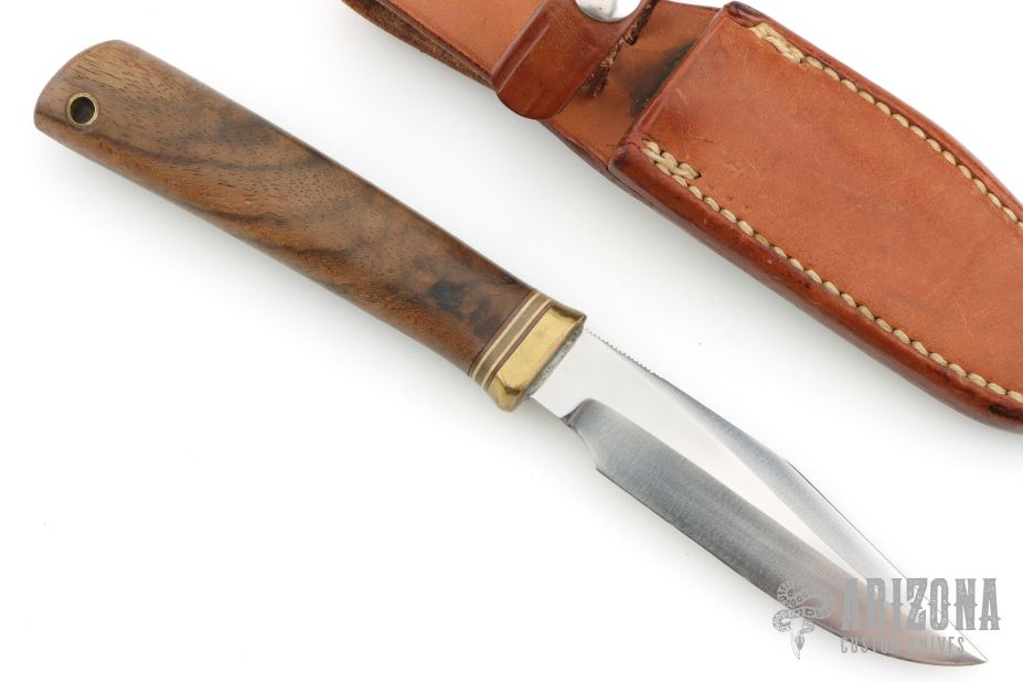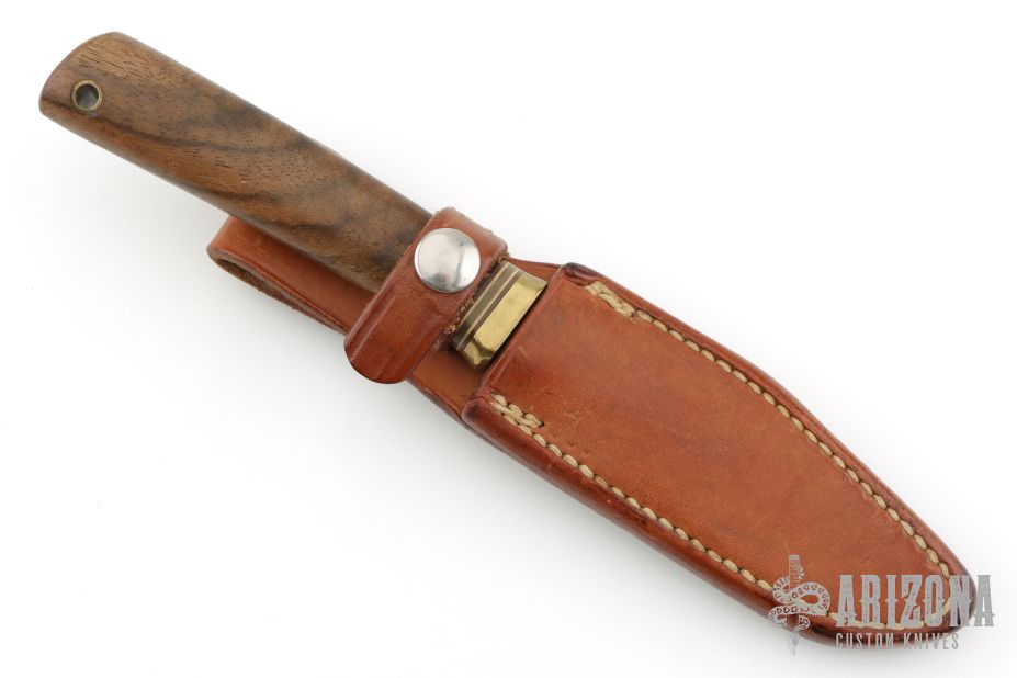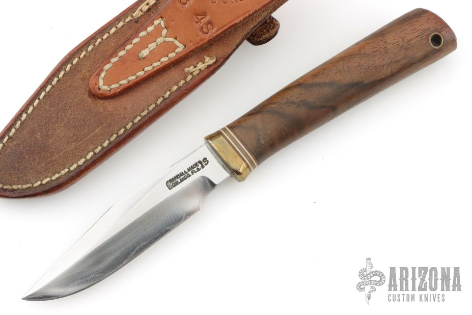 This Model 8-4 by Randall Made Knives features a satin finished blade with sharpened top edge and notched thumbrest, .172" blade thickness, and .881" blade depth, hidden tang construction. Especially suitable for small fish and feathered game. The handle has a brass reduced guard, walnut grip with red/white/blue spacers, lanyard hole at the butt. Comes with a Johnson Roughback brown leather sheath. Has some scratches, has been sharpened, otherwise good condition.
