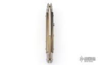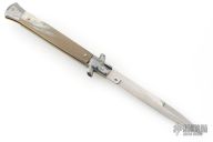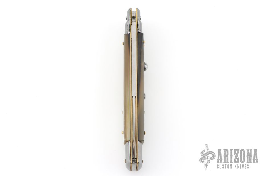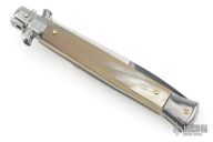 This Swivel Bolster Auto has a dagger ground blade with false top edge. The handle is composed of a steel front and rear bolsters, brass liners all complemented by honey horn scales. Excellent condition.