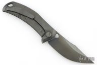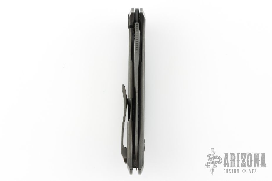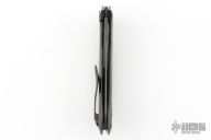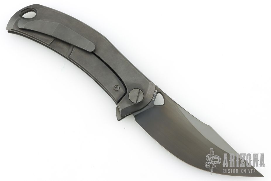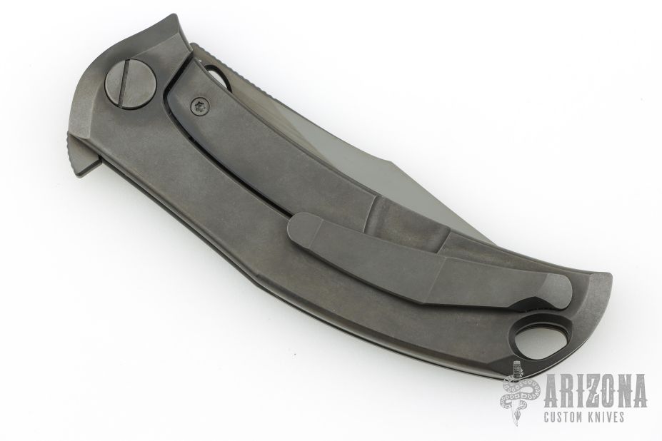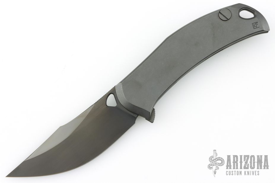 This Barm Knife by Custom Knife Factory features a DLC finished clip point blade with polished swedge, notched thumbrest and thumbhole. The handle has a DLC tumble finished titanium frame with matching backspacer with tip up pocket clip. Comes with CFK velcro case, extra hardware and COA. Nice detent, lockup and blade seating. #158 and dated 11/24. Excellent condition.