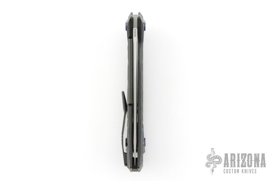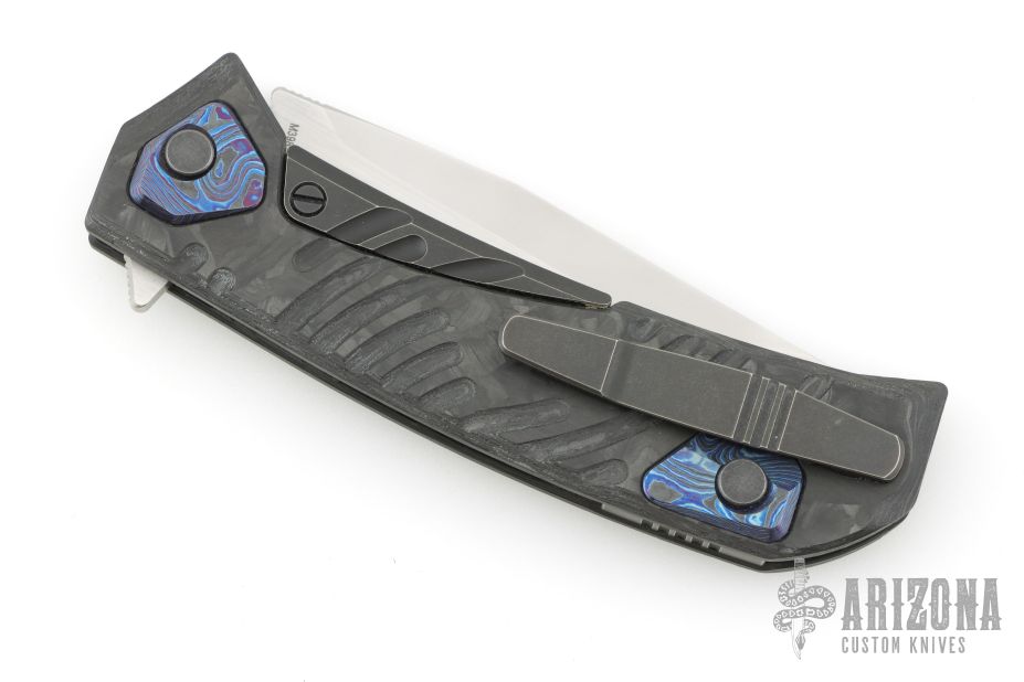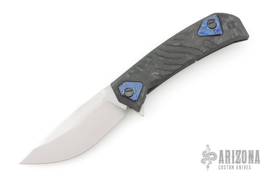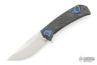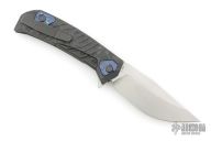 This awesome knife is designed by Aleksey Konygin and features a M398 blade, milled carbon fiber scales & ZircuTi accents with a tip-up pocket clip. Opens by flipper tab on a multi-row bearing pivot.  S/N 1 dated 2-25.  Includes maker's padded case, extra hardware, and COA.  Excellent Condition.