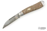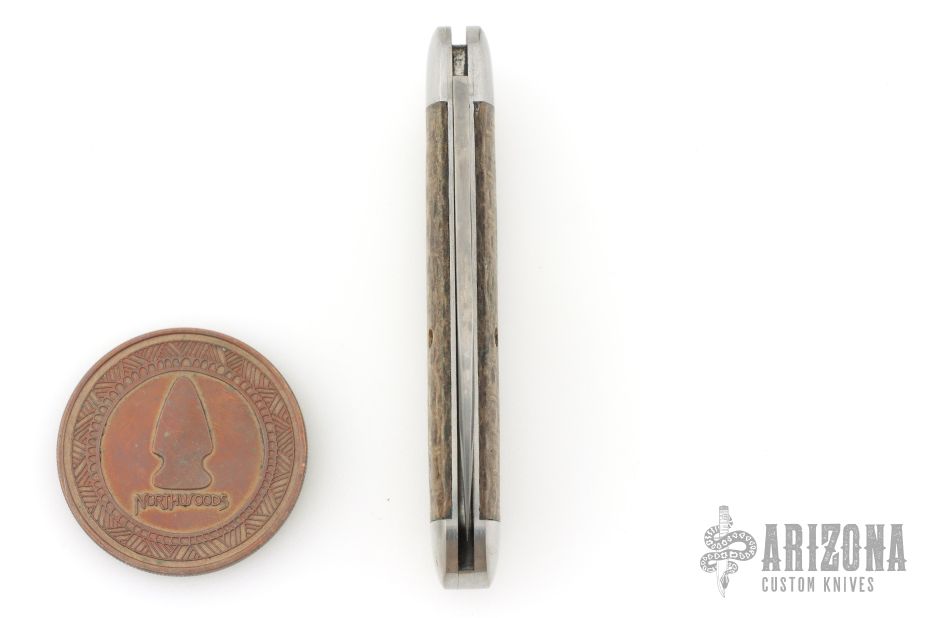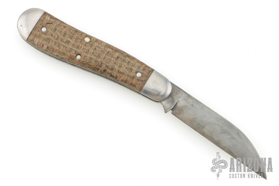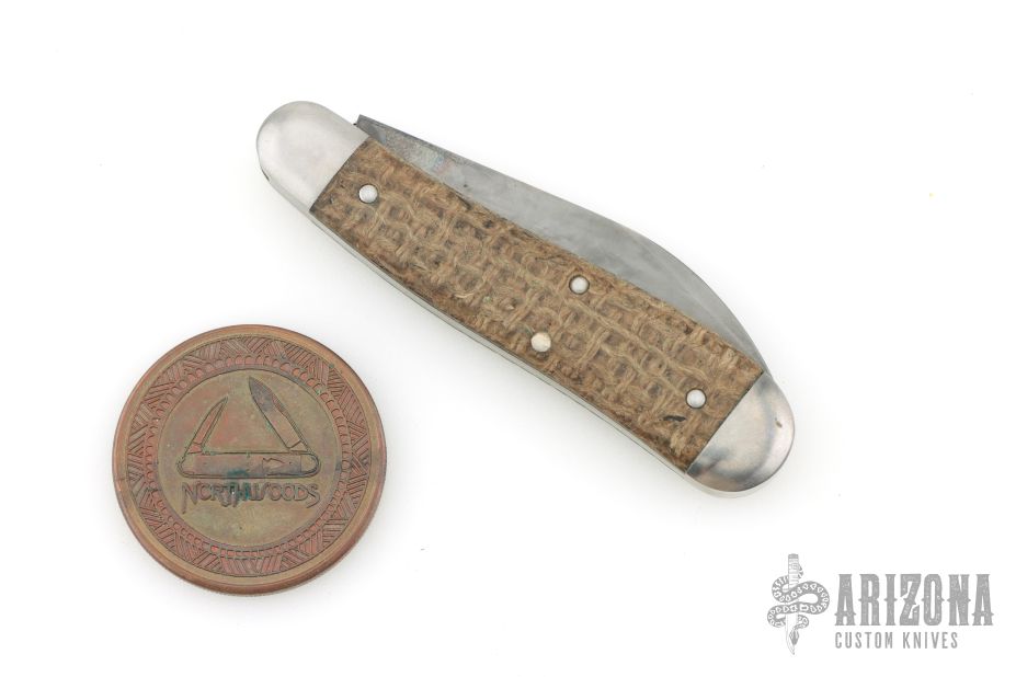 This Northwoods Knives Fayette Jack features a wharncliffe style blade with swedge and long pull. The handle is comprised stainless steel bolsters, burlap covers over stainless steel liners and spring, steel escutcheon. Includes leather case and a Northwoods challenge coin. Has some patina. Excellent condition.