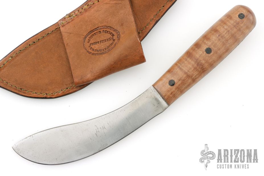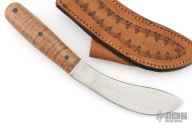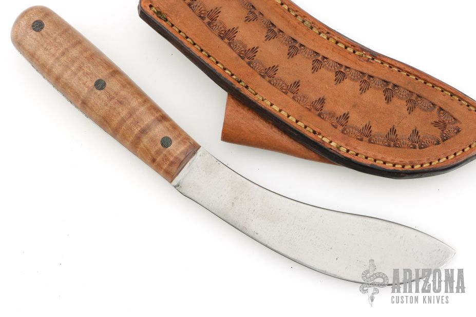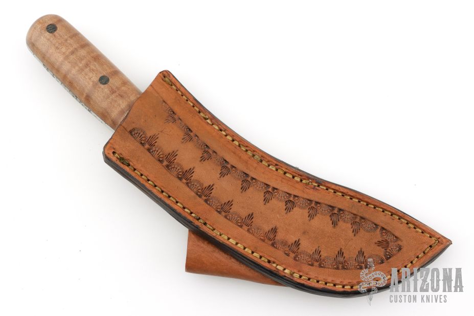 This Nesmuk by R. A. Frazier features a satin finished upswept blade, .134" blade stock and 1.197" blade depth, full tang construction. The handle has curly maple scales with black canvas micarta pins. Comes with a hand tooled brown leather sheath. Has some scratches and oxidation, the makers mark is faint, but visible, otherwise good condition.