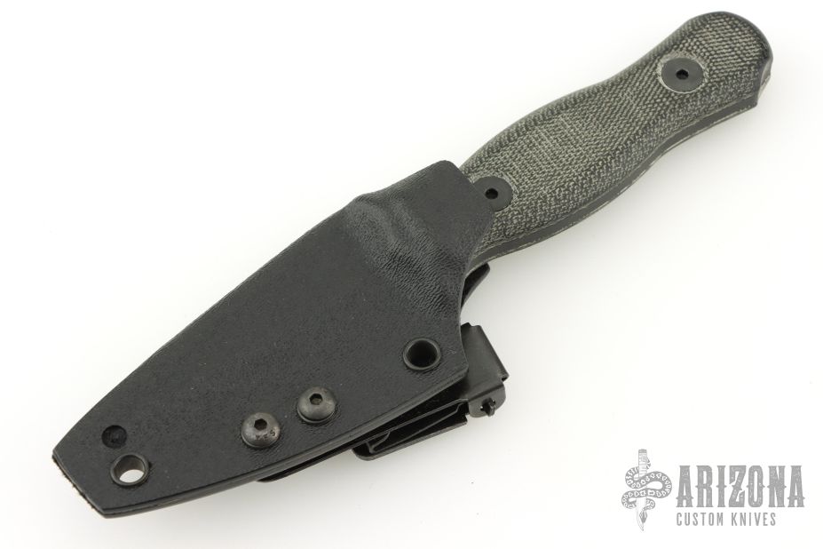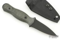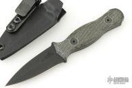 This Combat Dagger by Half Face Blades features a black double-edged blade with a full tang construction, .143" Blade Stock and 1" Blade Depth.  The handle has black canvas micarta scales.  Includes original box, papers and kydex sheath. Excellent Condition.