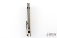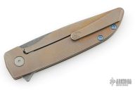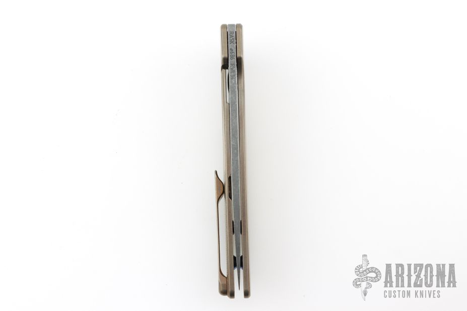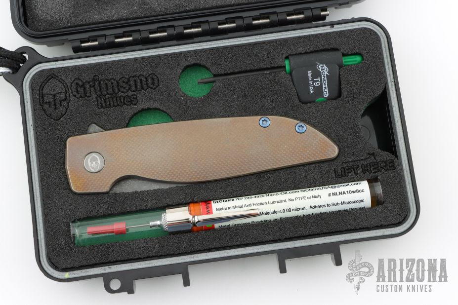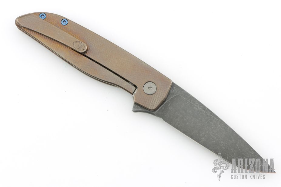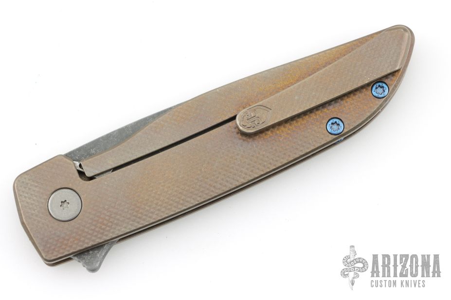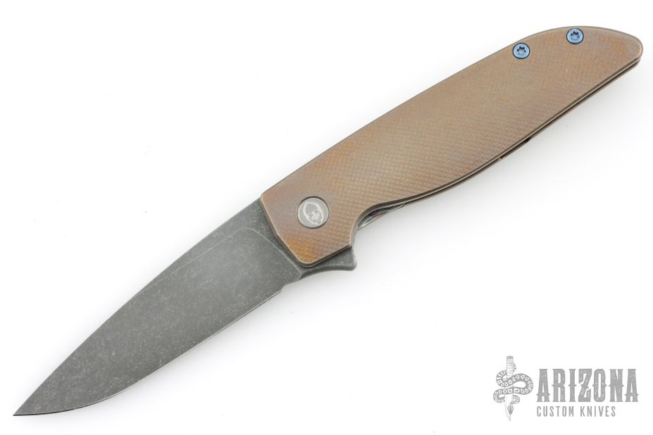 This Rask by John Grimsmo of Grimsmo Knives features an acid etched and tumble finished blade with notched flipper. The handle has a Crosshatch milled, stonewashed, and anodized titanium frame with matching tip up clip that has hidden screws, and titanium barrel spacers. Numbered #686 on the spine of the blade. Includes original box and COA dated OCT 22, 2021. Excellent condition.
