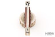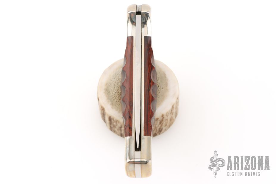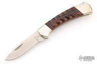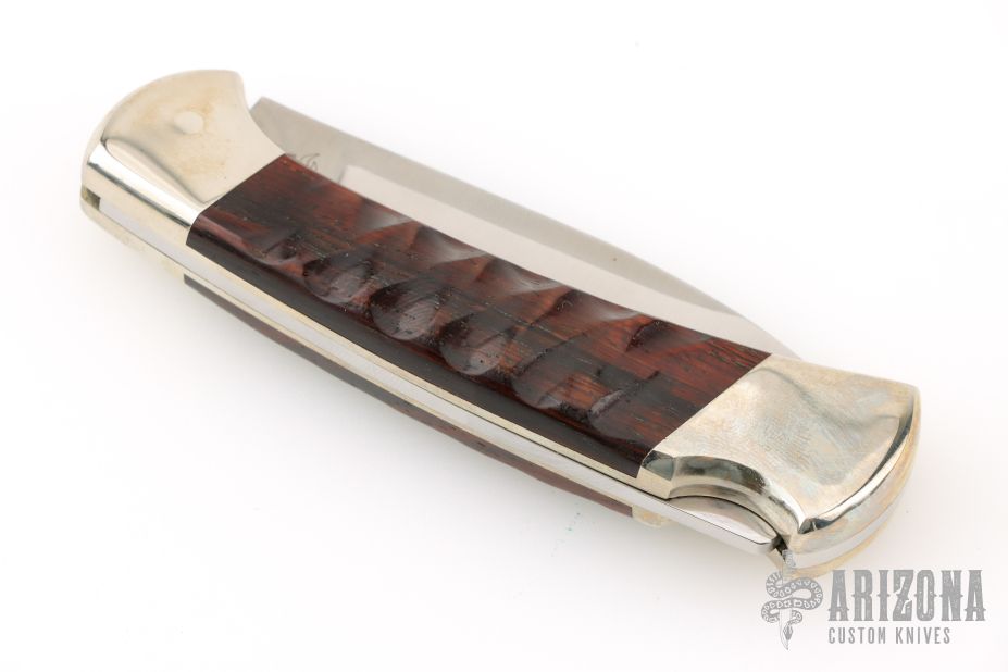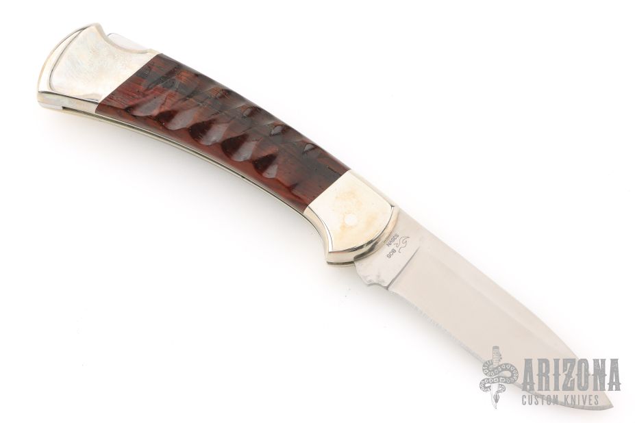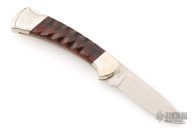 The Buck 112 Ranger features a droppoint blade with nail nick. The handle is made of nickel silver bolsters, liners and pommel with sculpted cocobolo scales. Comes with original wooden box, papers, and leather sheath. Excellent condition.