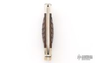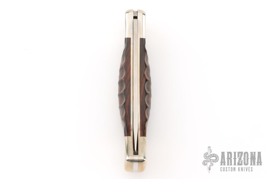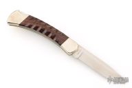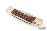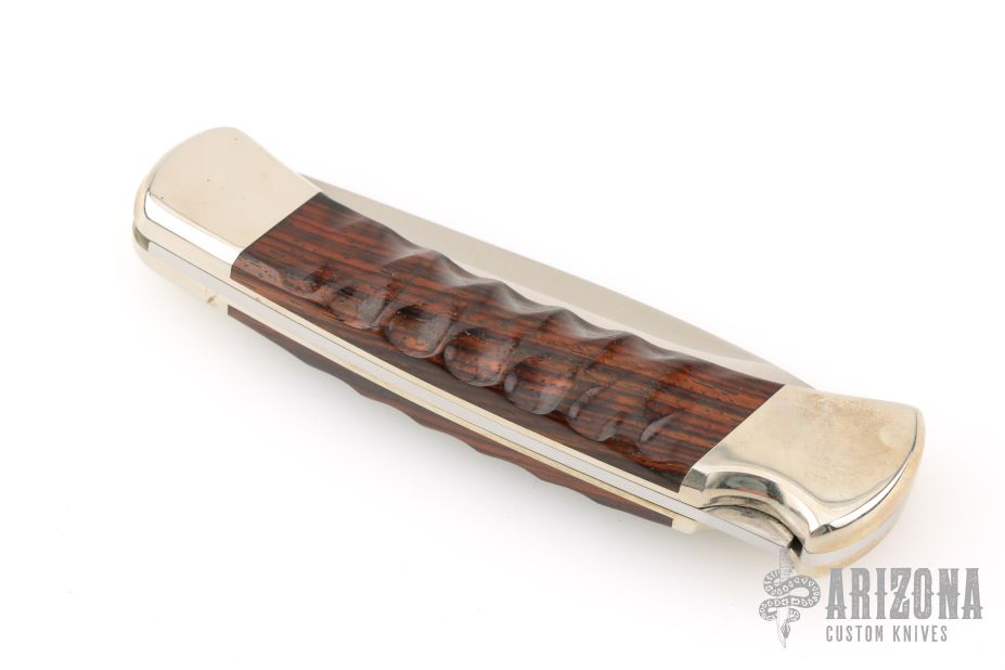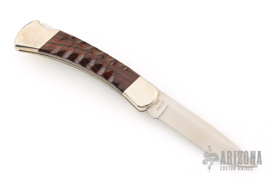 The Buck 110 Folding Hunter features a drop point blade with nail nick. The handle is made of nickel silver bolsters, liners and pommel with sculpted cocobolo scales. Comes with original wooden box, papers, and leather sheath. Excellent condition.