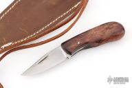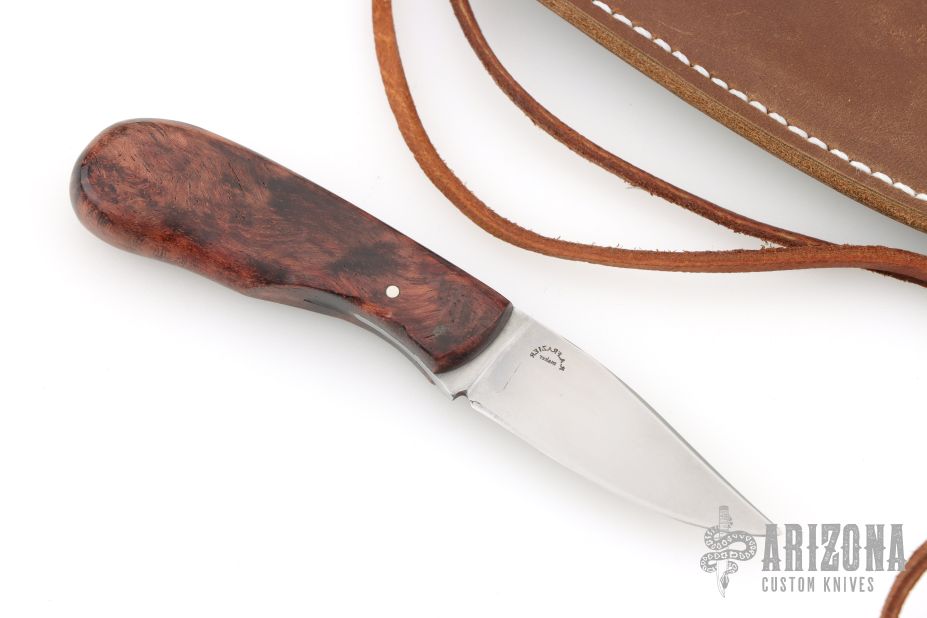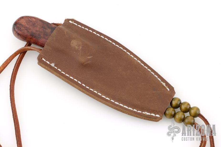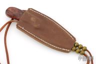 This neck knife by Ron Frazier features a stonewashed blade with nail nick, .101" blade stock and .736" blade depth, partial full tang construction. The handle has wood grip. Comes with a brown leather neck sheath. Excellent condition. The makers mark it etched backwards.
