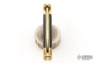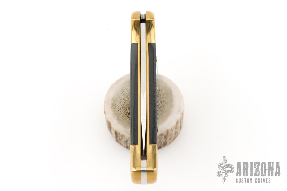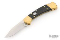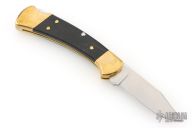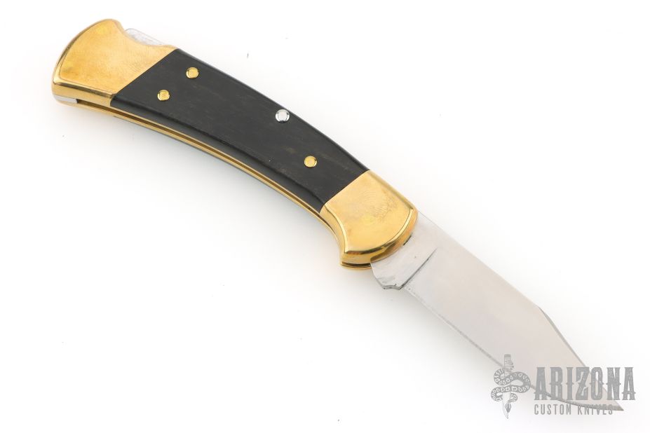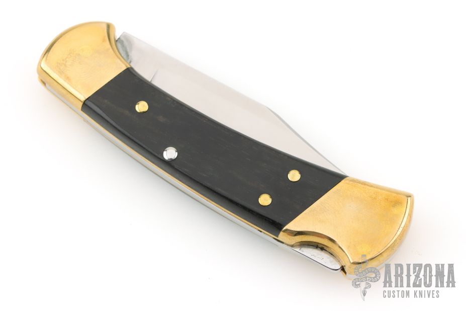 This Buck 112 Auto features a satin finished clip point blade. The handle has a brass frame with ebony wood scales. Comes with original box, papers, and sheath. Excellent condition.