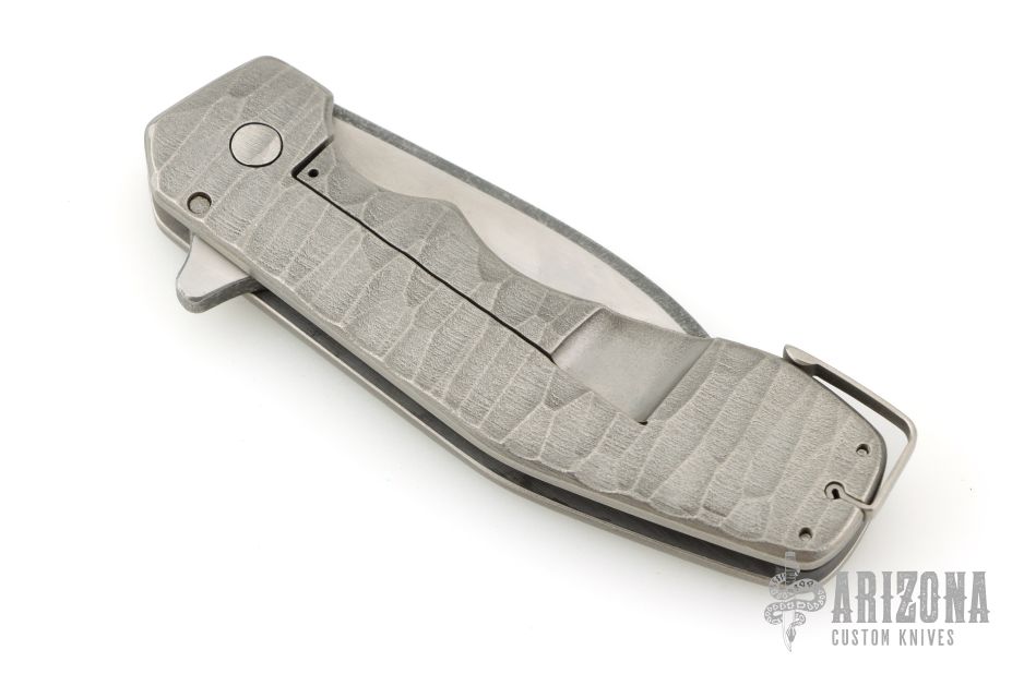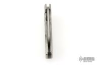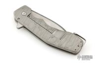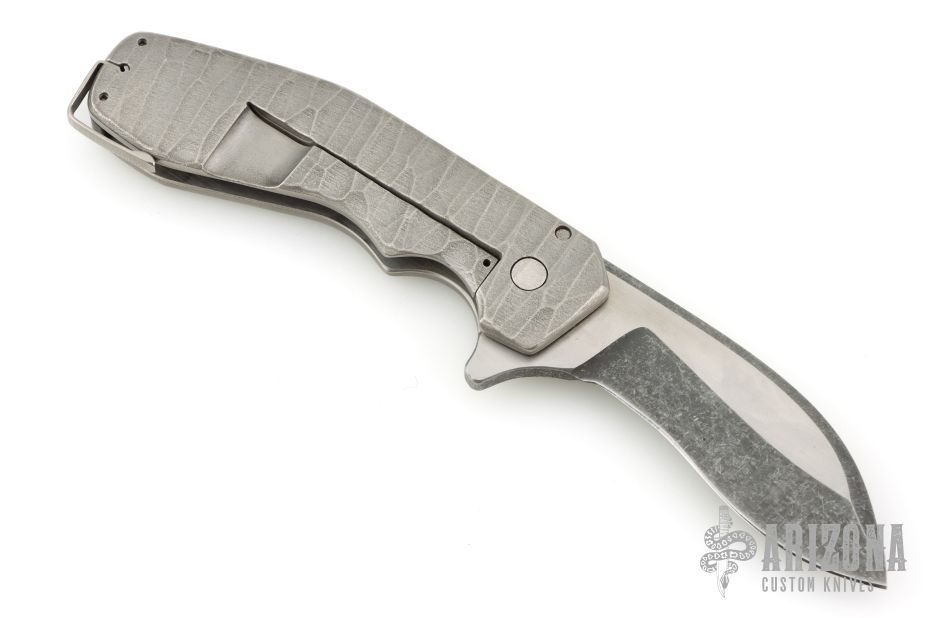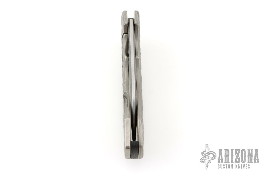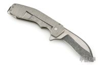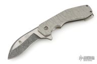 This Pocket Kukri features a satin and acid tumbled recurve blade with dual swedges. The handle has a textured and contoured titanium frame with carbon fiber backspacer and tip up clip. Has a light scratch on the blade, excellent condition otherwise.