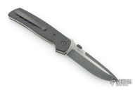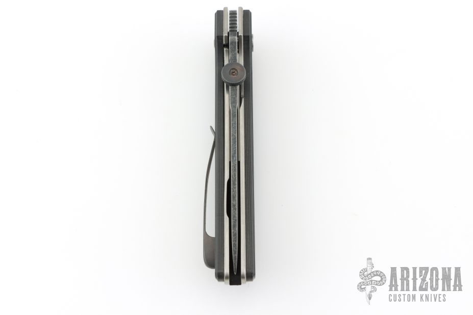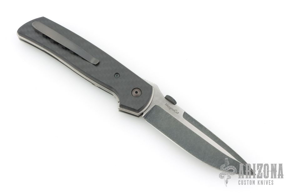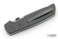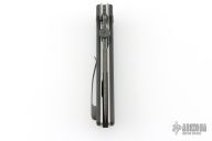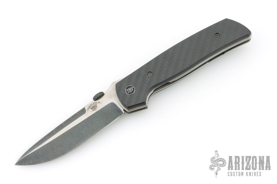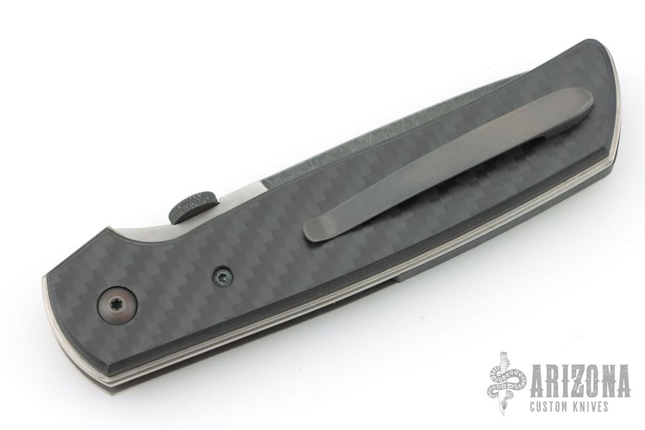 This ATCF OG Variant II from Bob Terzuola features a two-tone dark stonewashed drop point blade with swedge, thumbdisc and a notched thumbramp. The handle has carbon fiber scales, titanium liners with stainless lockface insert, black backspacer, tip up titanium clip with hidden screws. Rides on bearings, nice detent, lockup and blade seating. Excellent condition.