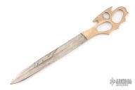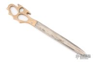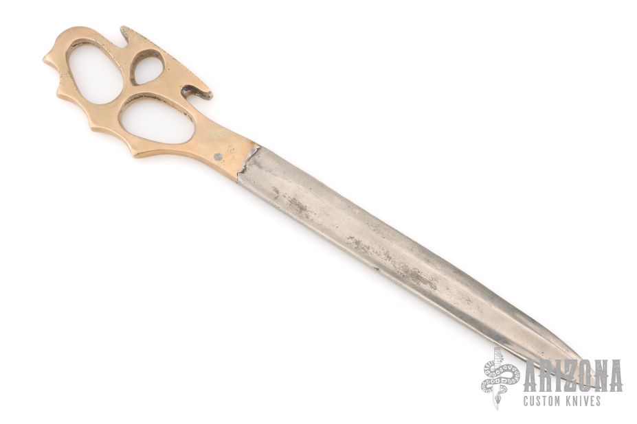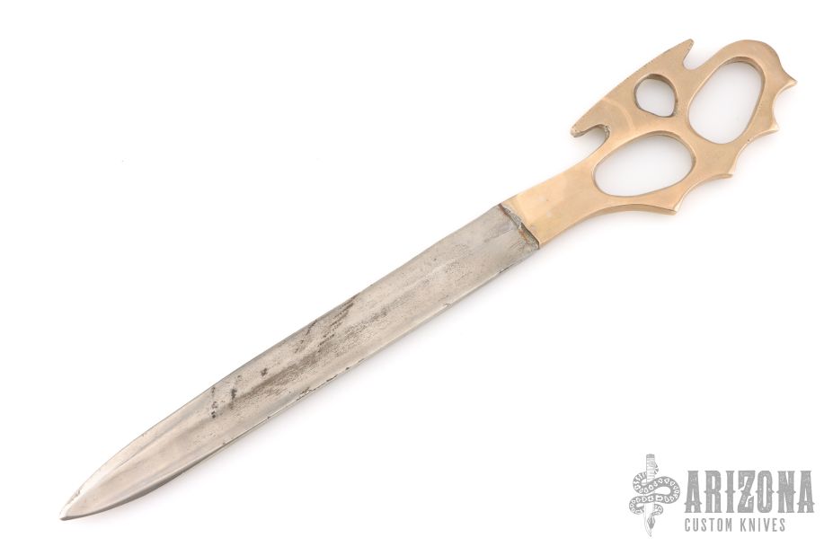 This WWII Theater Trench Knife features a reverse grip blade fullers that was made from a cut down bayonet, .215" blade stock and 1.019" blade depth, hidden tang construction. The handle is cast brass Death's Head knuckle directly onto the blade. Has scratches and patina, otherwise good condition for its age.