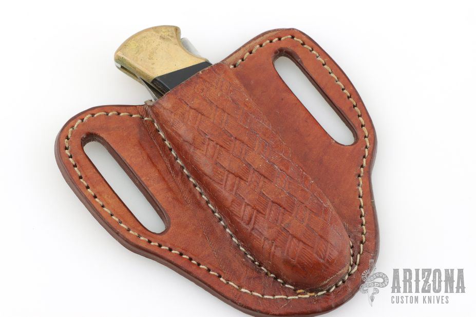 This vintage Buck 110 "folding hunter" features a satin finished clip point blade with nail nick. It has wood scales, brass bolsters and frame. Comes with hand tooled leather be;t sheath. Dated 2002. Has patina on the blade, some scuffs and scratches, great condition otherwise.