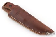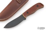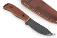 This knife by Camillus features a black coated blade with .125" blade stock and 1.225" blade depth, full tang construction. The handle is comprised of brown canvas micarta scales with lanyard bail in pommel. Comes with original leather belt sheath. Has some scuffs/scratches, great overall condition.